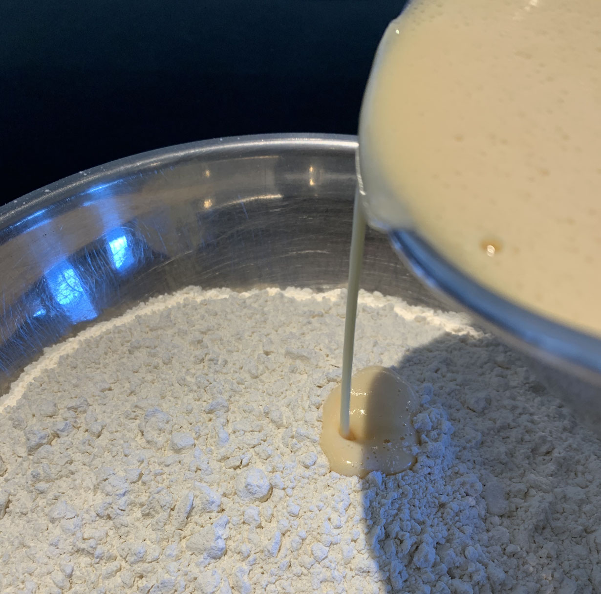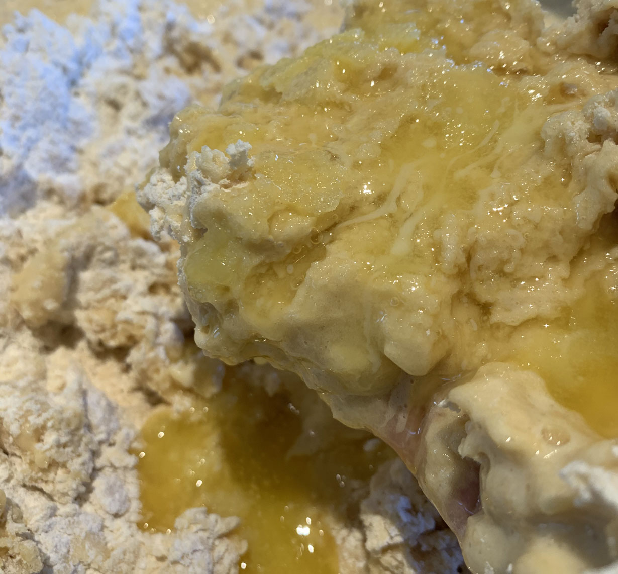After 2 hours, beat the eggs while you melt the butter. Add the cognac, vanilla powder and half the melted butter to the eggs. Pour the egg mixture into the flour and blend with your hands. Pour the remaining butter onto your hands as you are mixing the dough to keep it from sticking to your hands.