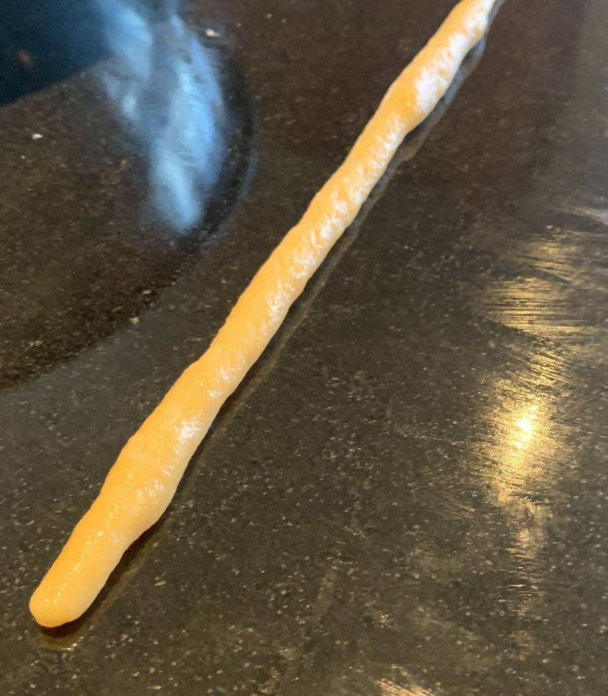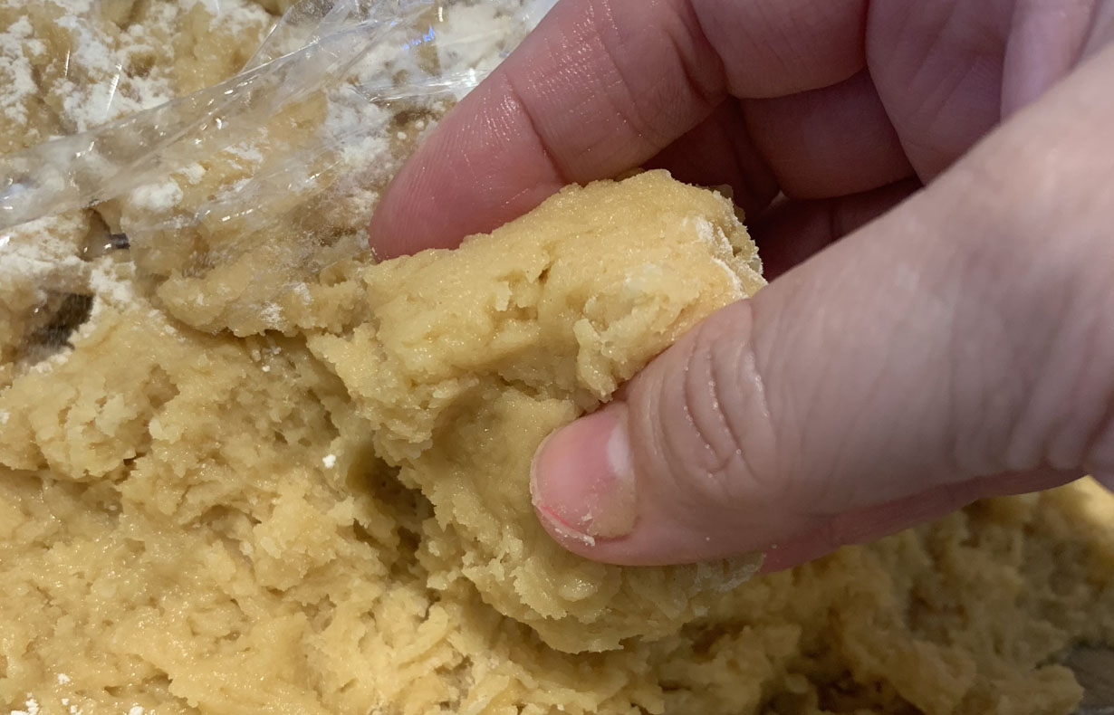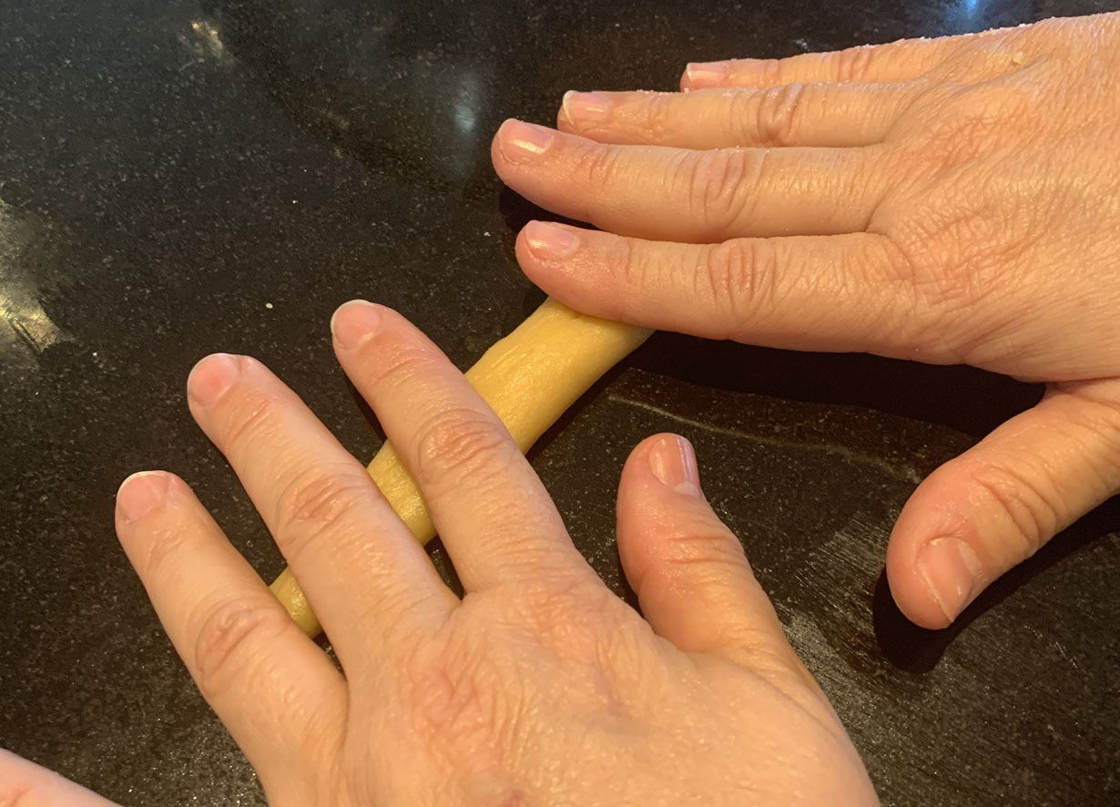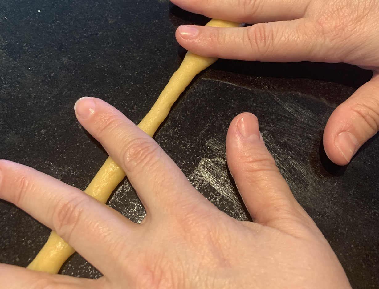 Once all the butter is incorporated, dust the surface with flour and cover with a plastic wrap. The dough is a bit runny. Don’t worry about this as you will be kneading it to form the cookies. Take a bit of the dough into your palm and knead it from one hand to the other until the dough is smooth. Once smooth, use your palms to roll the dough into a cylinder shape. Place the cylinder on a non-stick surface, and using both your hands, roll the cylinder outwards. Once the cylinder is thin and long, you can shape it into various shapes.