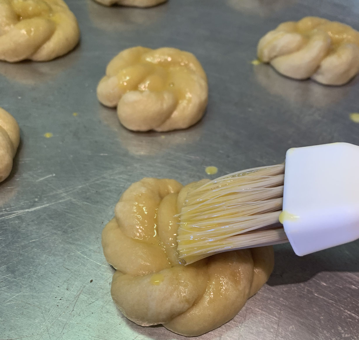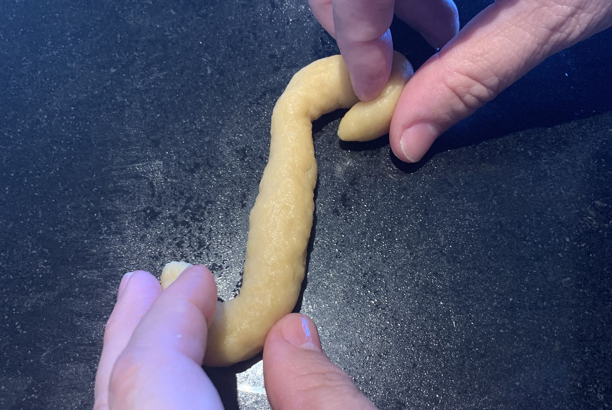 Circle Braid: Fold the dough cylinder in half and twist. Take one end of the twisted cylinder and wrap it around until it forms a circle shape. Twist: Fold the cylinder dough in half and twist. Braid: Cut the cylinder in three equal lengths. Form an upside down “V” with two pieces and place the third down the center. Place the left piece over the center and then the right piece over the piece just moved over. Continue until you reach the end. S-Shape: Towards opposite directions, turn in each end of the cylinder towards the inside.