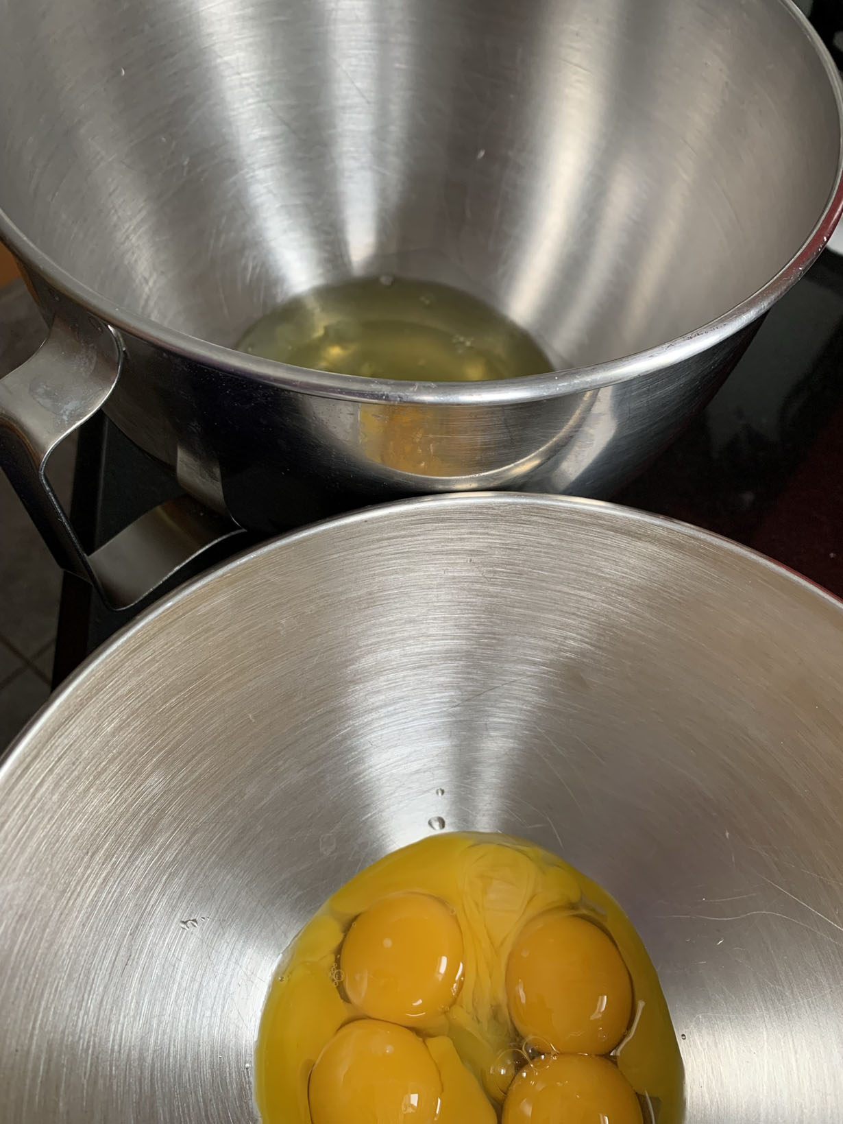 In a stand mixer fitted with the whisk attachment, beat the egg whites until they form soft peaks. Gradually add 1/2 cup of the sugar and beat until the egg whites have stiff peaks. Set aside. In the mixing bowl with the egg yolks, add the vanilla and the remaining sugar. In a stand mixer fitted with the whisk attachment, beat for 5 minutes until light and yellow in color.