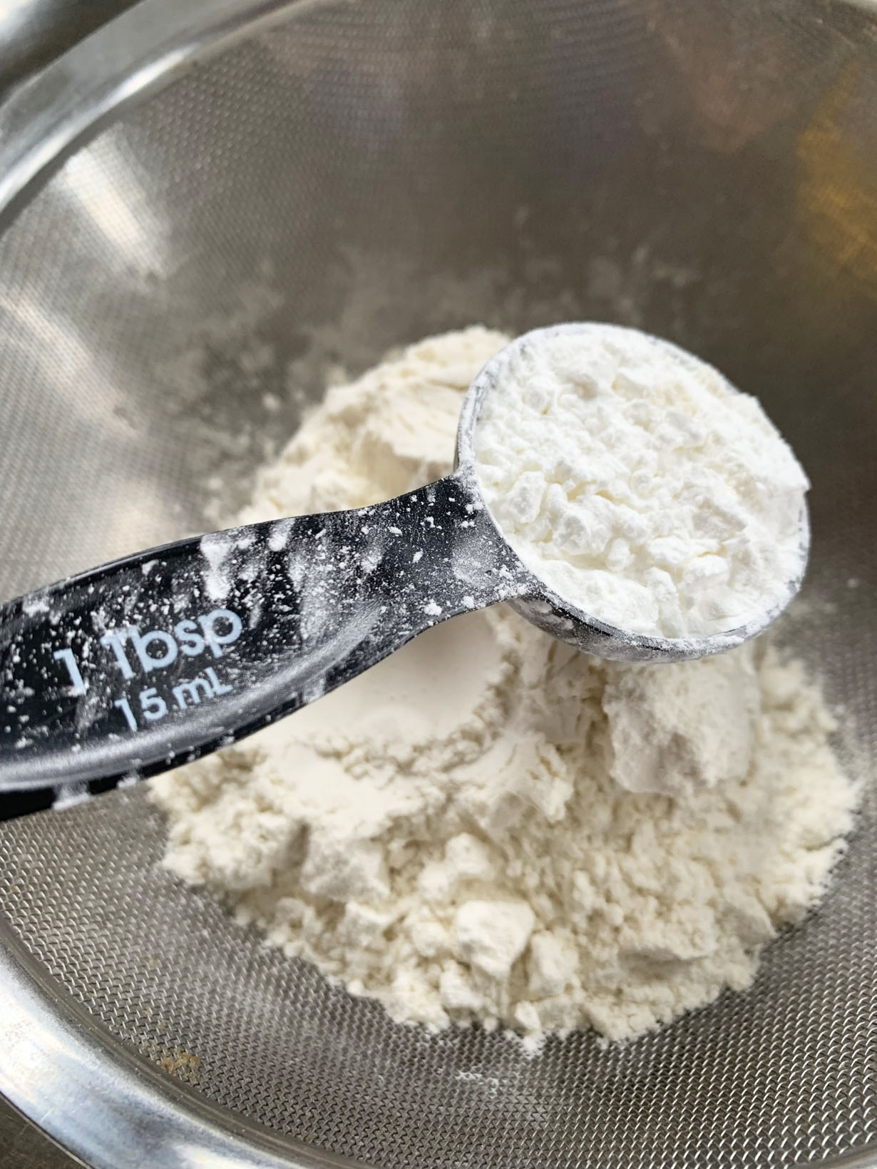 Preheat the oven to 350°F and line a baking sheet with parchment paper or a silicone mat. Separate the egg whites and yolks into two separate mixing bowls. Sift the flour, cornstarch, and salt and set aside.