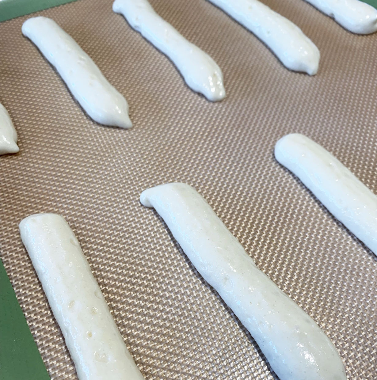 Transfer the batter into a piping bag. Snip off the end to make a 1/2” opening and pipe the batter into 4” long lines. Leave 2” between the cookies. If your end has a tip, moisten your fingertip with a bit of water and gently press down. Sprinkle sugar over the cookies and bake for 15 minutes in the preheated oven. Allow the cookies to cool for 10 minutes on the baking sheet. If you are using them for tiramisu, allow the cookies to sit uncovered for 1 day, otherwise, store them in an airtight container.