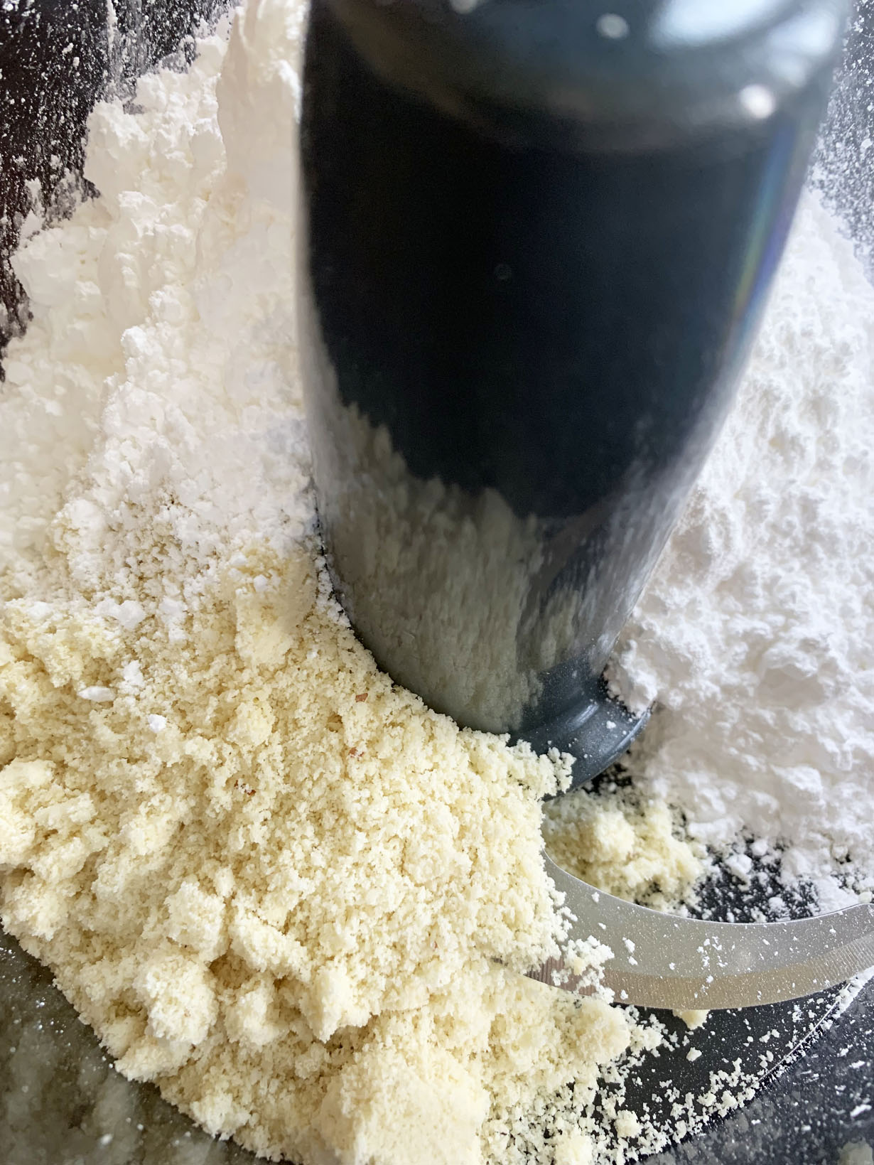 In a food processor, combine the almond flour and the powdered sugar and pulse until it is an extra fine texture (the almond flour will be the same consistency as the powdered sugar). Sift the mixture through a sieve into a large bowl.