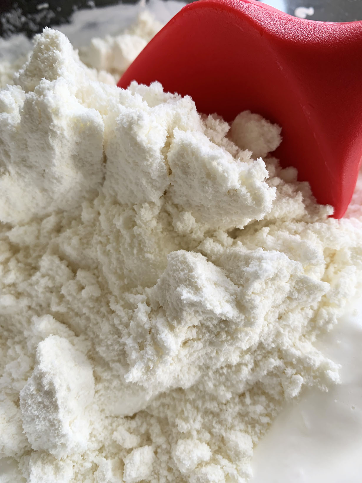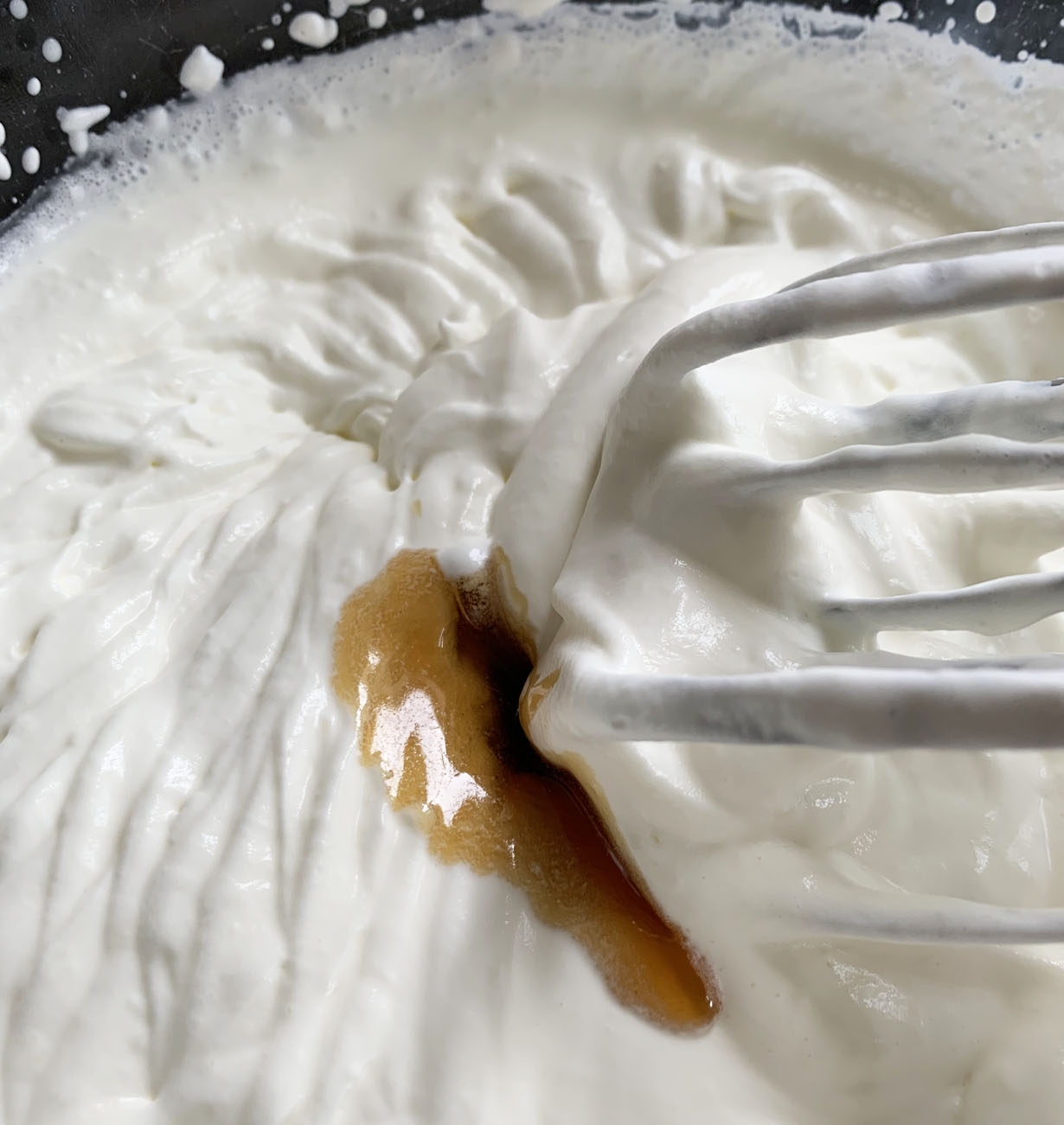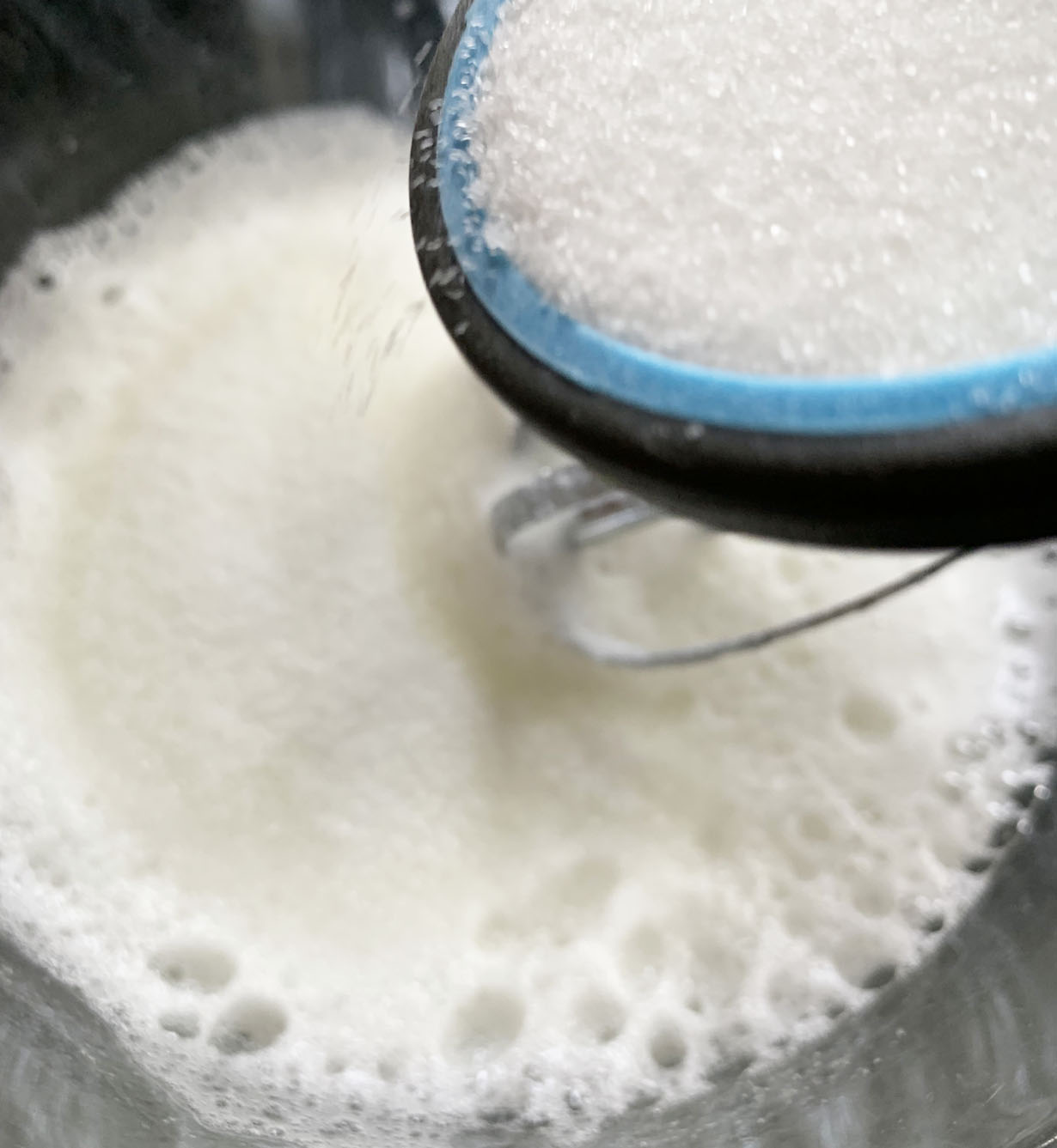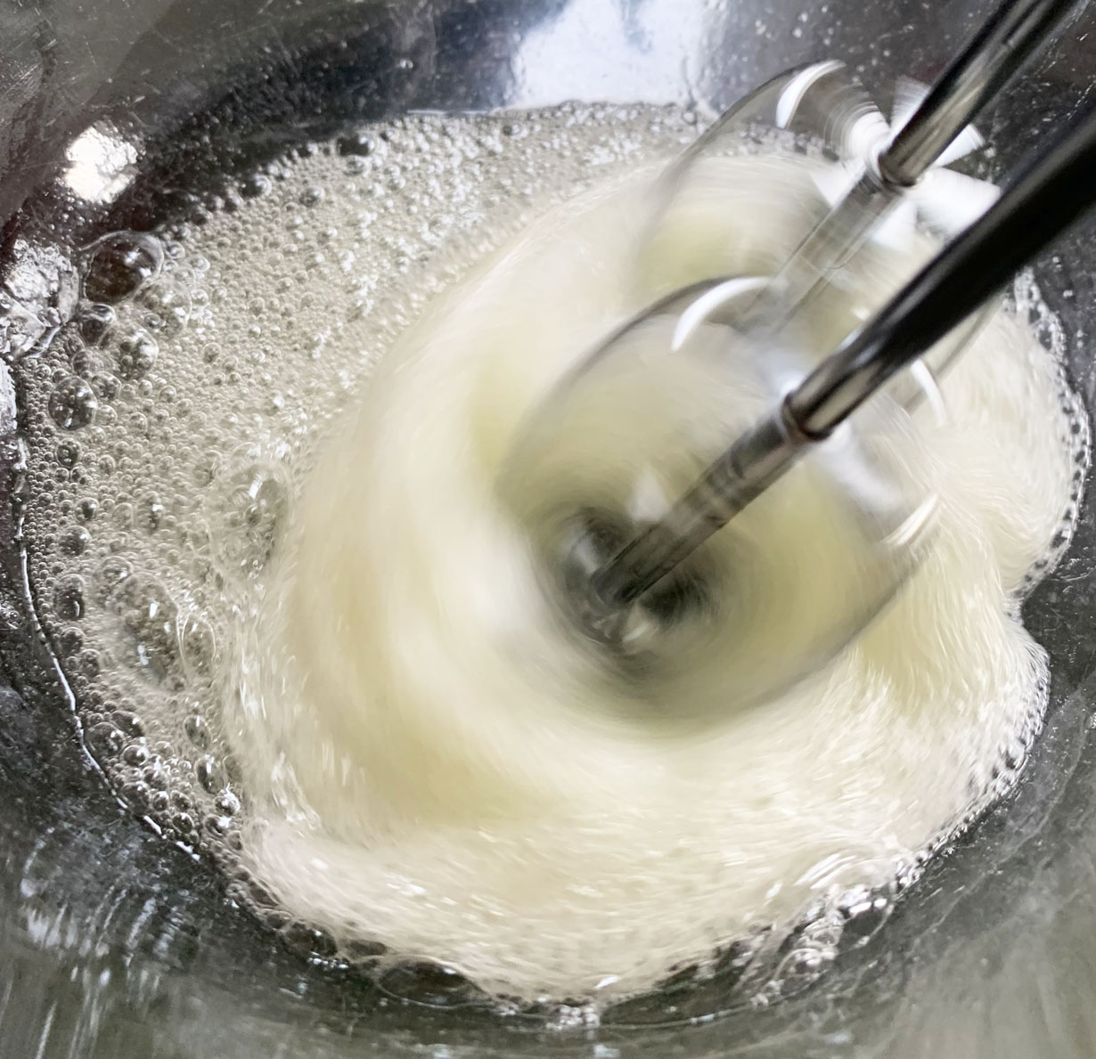 Beat the egg whites and salt in a mixing bowl until frothy. Add the granulated sugar gradually while beating. Continue to beat until stiff peaks form and the mixing handle does not drop the egg when lifted. Add the extract of choice (depending on the flavor of the filling). For this filling, I used almond extract. Beat until combined.