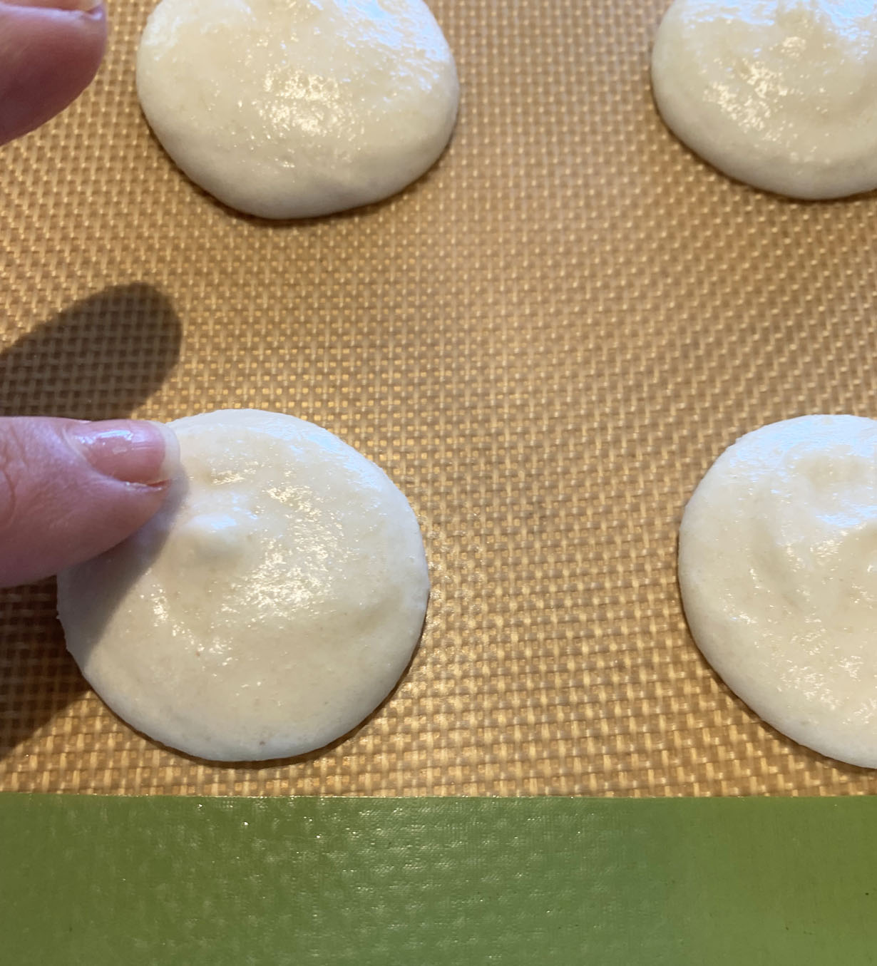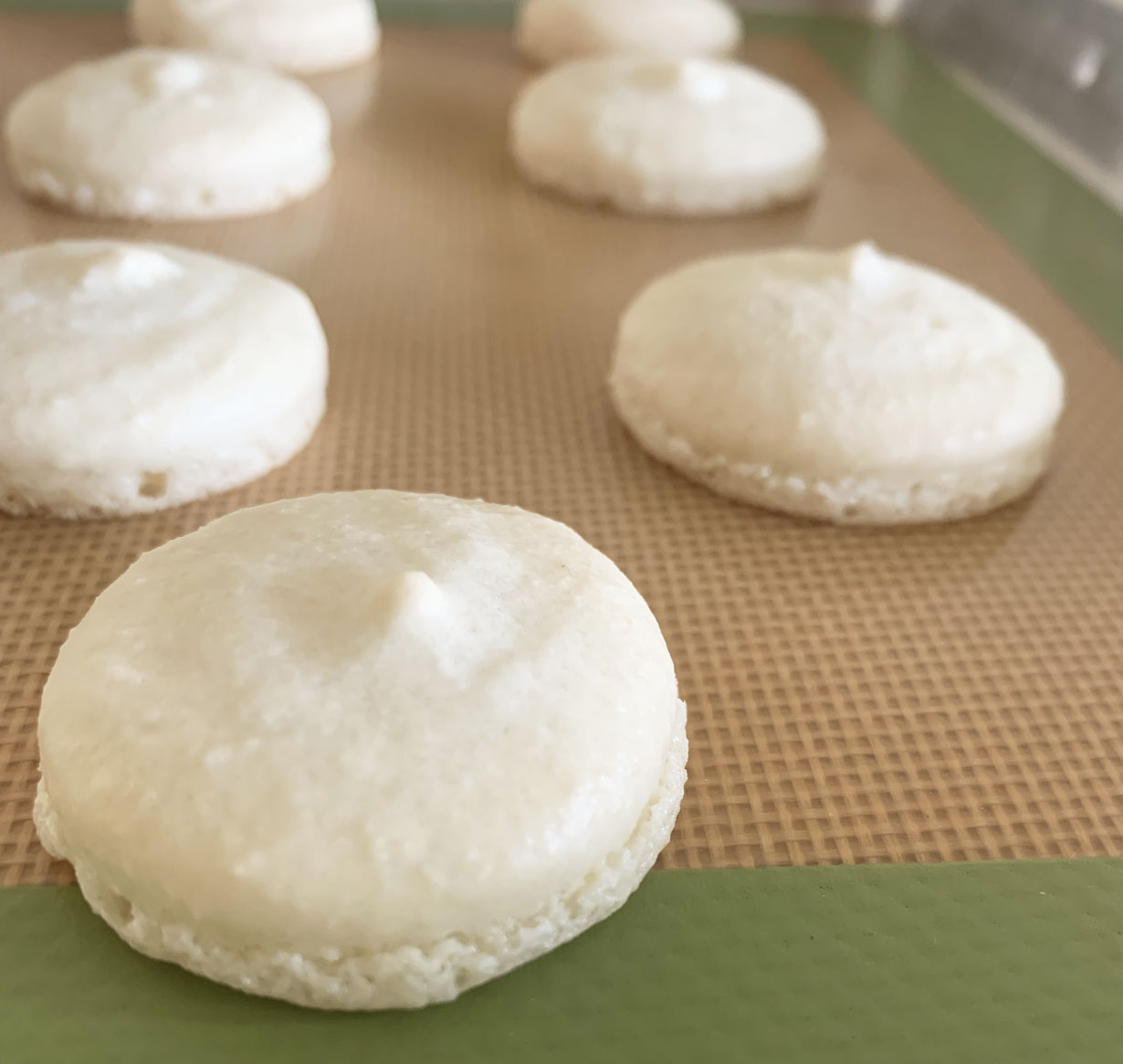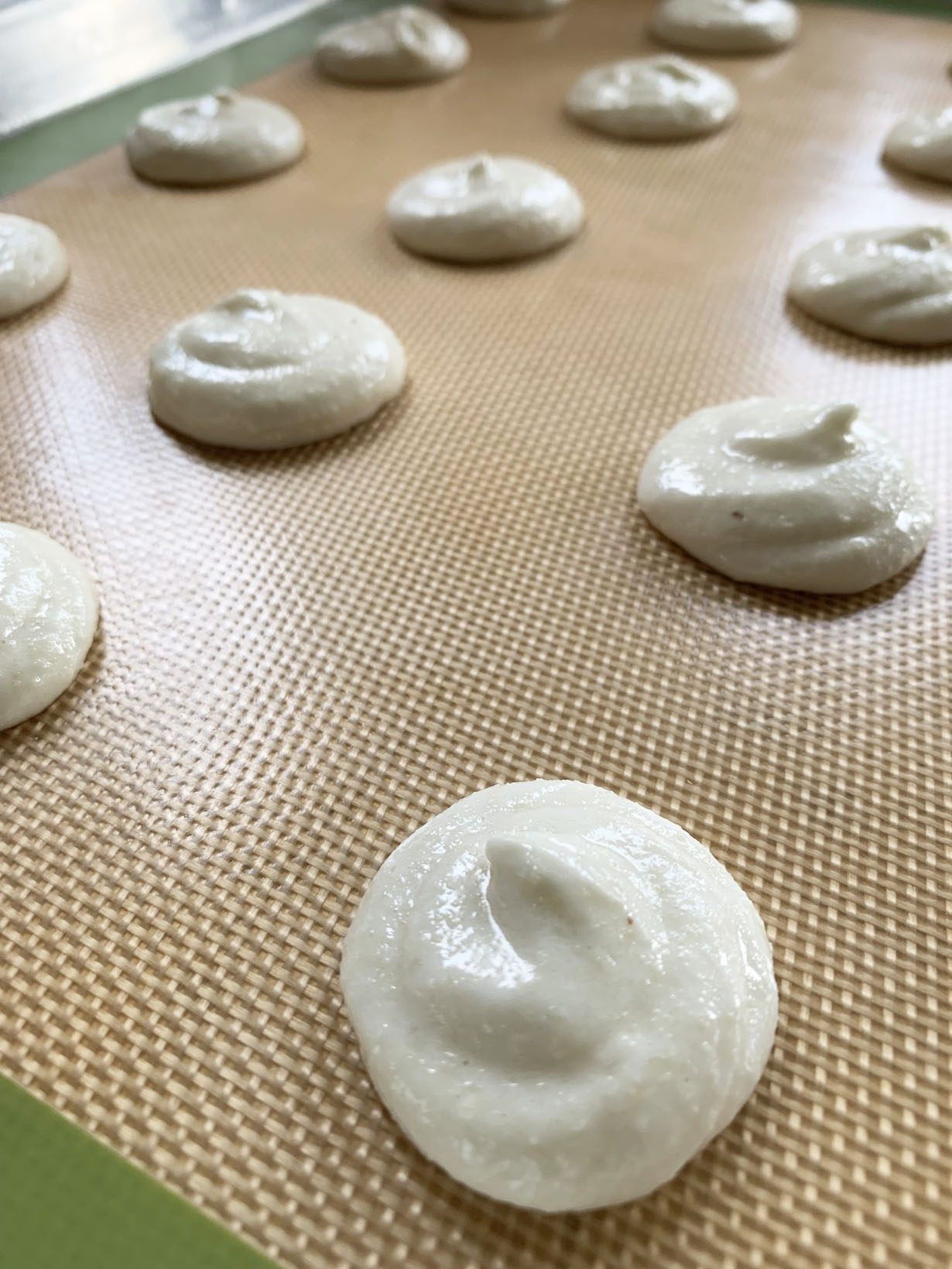 Line your baking sheet with parchment paper or a silicone tray. Pipe the macarons onto the lined baking sheet spacing them at least 1 inch apart. Each macaron should be approximately 1 1/2” in size. Tap or drop the baking sheet onto a flat surface a few times to release any air bubbles. Allow the macarons to rest for 1 hour. When you place your fingers on the top of the macaron, they should feel dry to the touch.