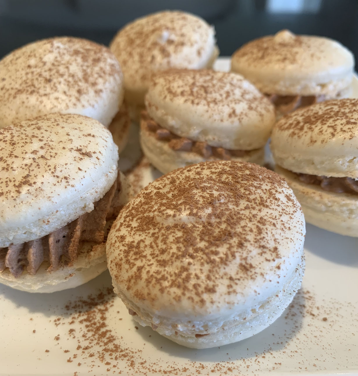 In the meantime, prepare the filling by whipping the cream until it forms stiff peaks. Add the simple syrup. For this recipe, I used a coffee infused simple syrup. Place a few heaping tablespoons of the whipping cream into the cocoa and mix together to form a paste. Transfer the cocoa paste back into the whipping cream and beat until fully incorporated. Transfer the filling to a piping bag fitted with a star tip. Add a dollop of the filling to the macaron shell and top it with a second shell to create a sandwich. Dust the top with cocoa powder. Place in an airtight container in the refrigerator to store. Makes 26 cookies.