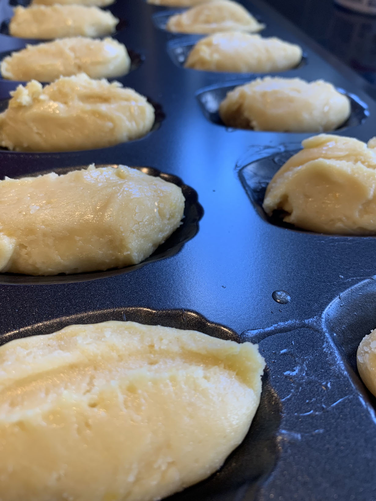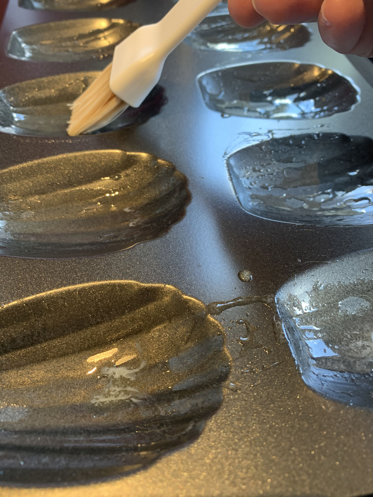 While the batter is resting, preheat the oven to 350°F and, using a pastry brush, brush the madeleine pans with melted butter. Use a tablespoon to scoop some batter and place into the center of the madeleine tray. You do not need to spread it out. Bake for 12 minutes until golden brown. Turn over the madeleine tray and drop them onto a wire rack to cool.