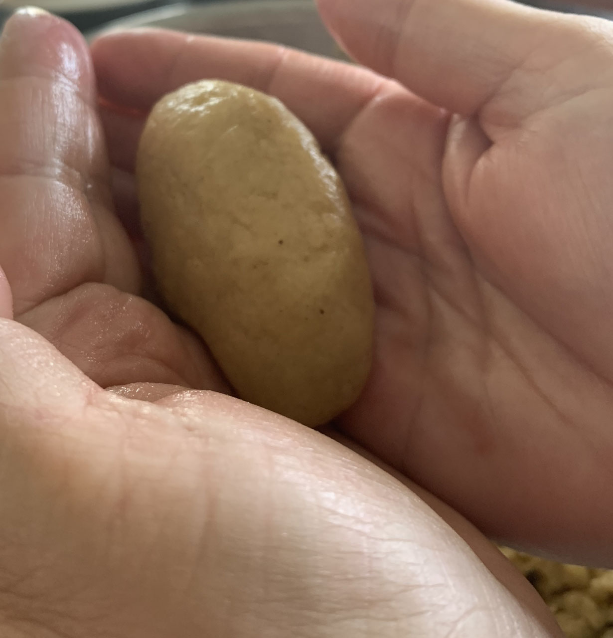 Using a tablespoon, take some of the dough and roll it in your hands to make a smooth oval shape. Place on a baking sheet with at least 1” of space in between. The cookies do not spread out, but you don’t want them to stick together. Bake for 30 minutes.