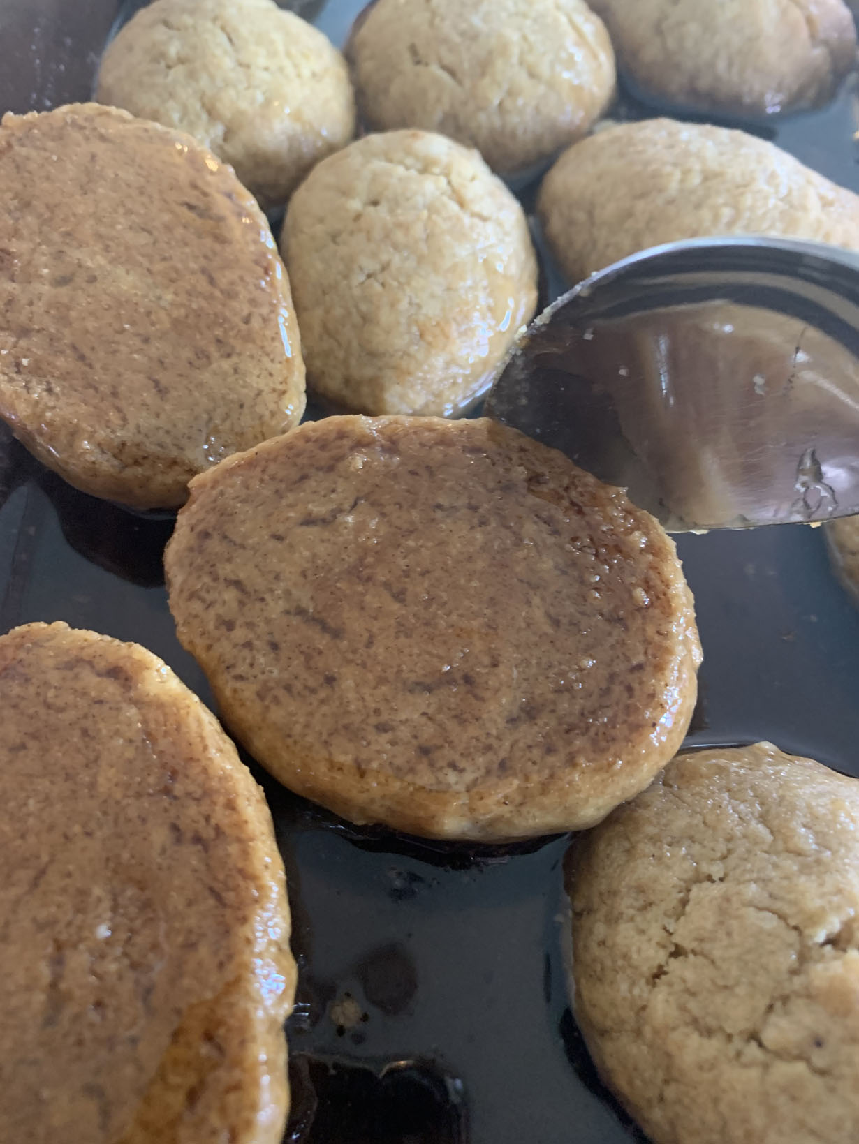 While the cookies are baking, prepare the syrup by mixing the honey, sugar and water and cooking on a medium heat until it starts to foam up. Remove from the heat once foaming.