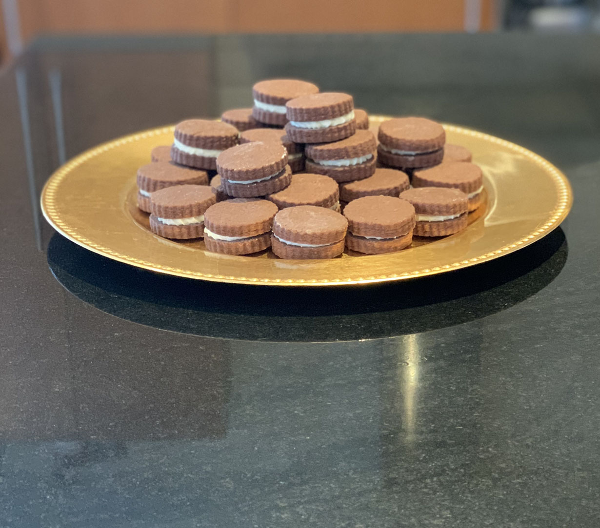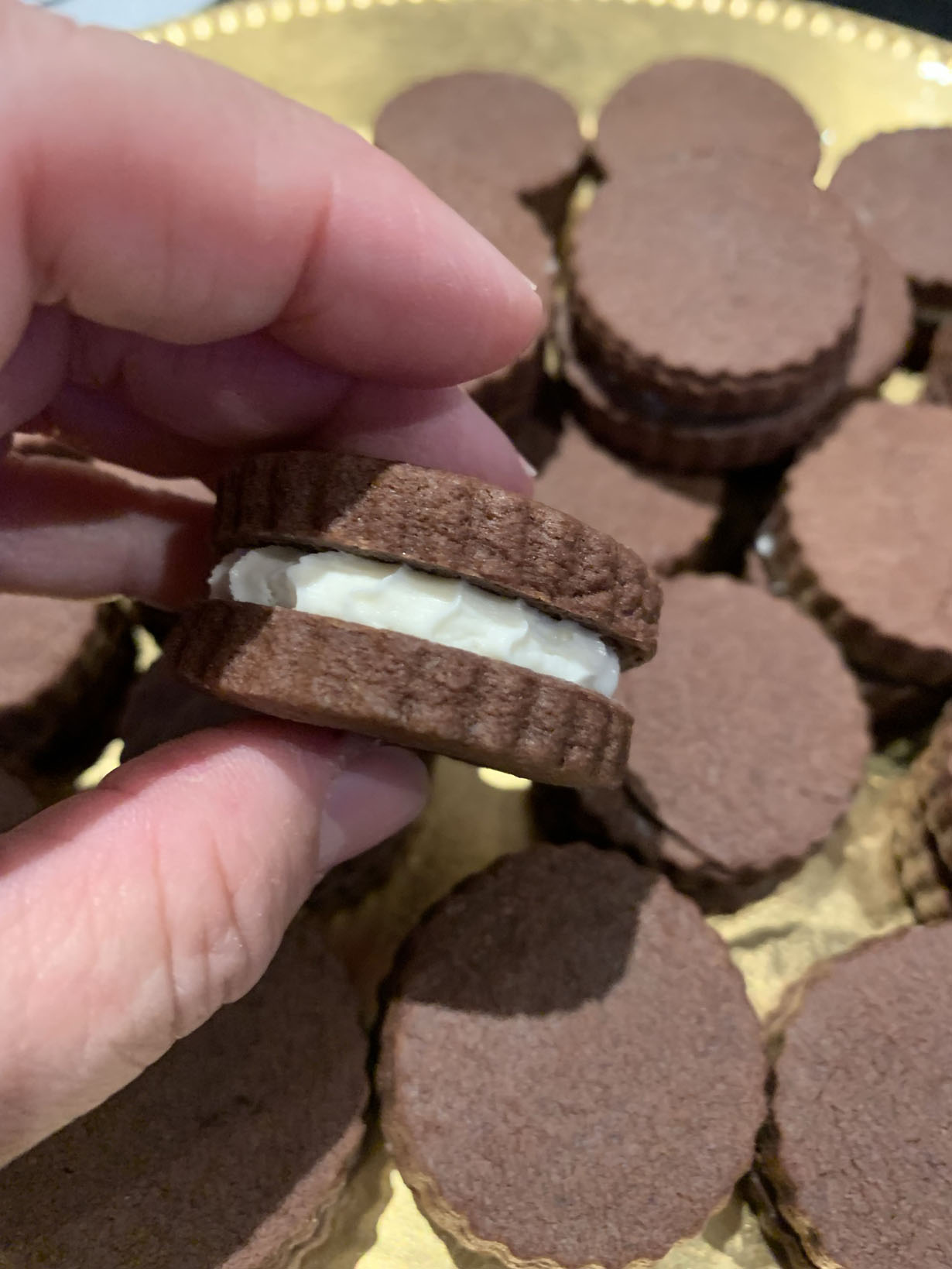 Bake the cookies for 12 to 14 minutes and allow them to sit in the cookie sheet for 5 minutes before transferring to a wire rack to cool completely. While the cookies are cooling, prepare the filling. In a mixer fitted with the paddle attachment, beat together the confectioner’s sugar, butter, vanilla, and whisk until smooth and creamy. Slowly add the melted chocolate. Transfer to a piping bag fitted with a star end attachment. On the cooled cookies, pipe drops of frosting, fill one side, and sandwich with another cookie.