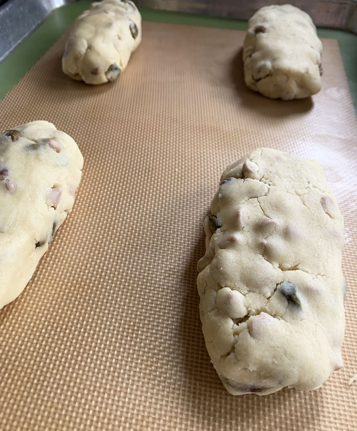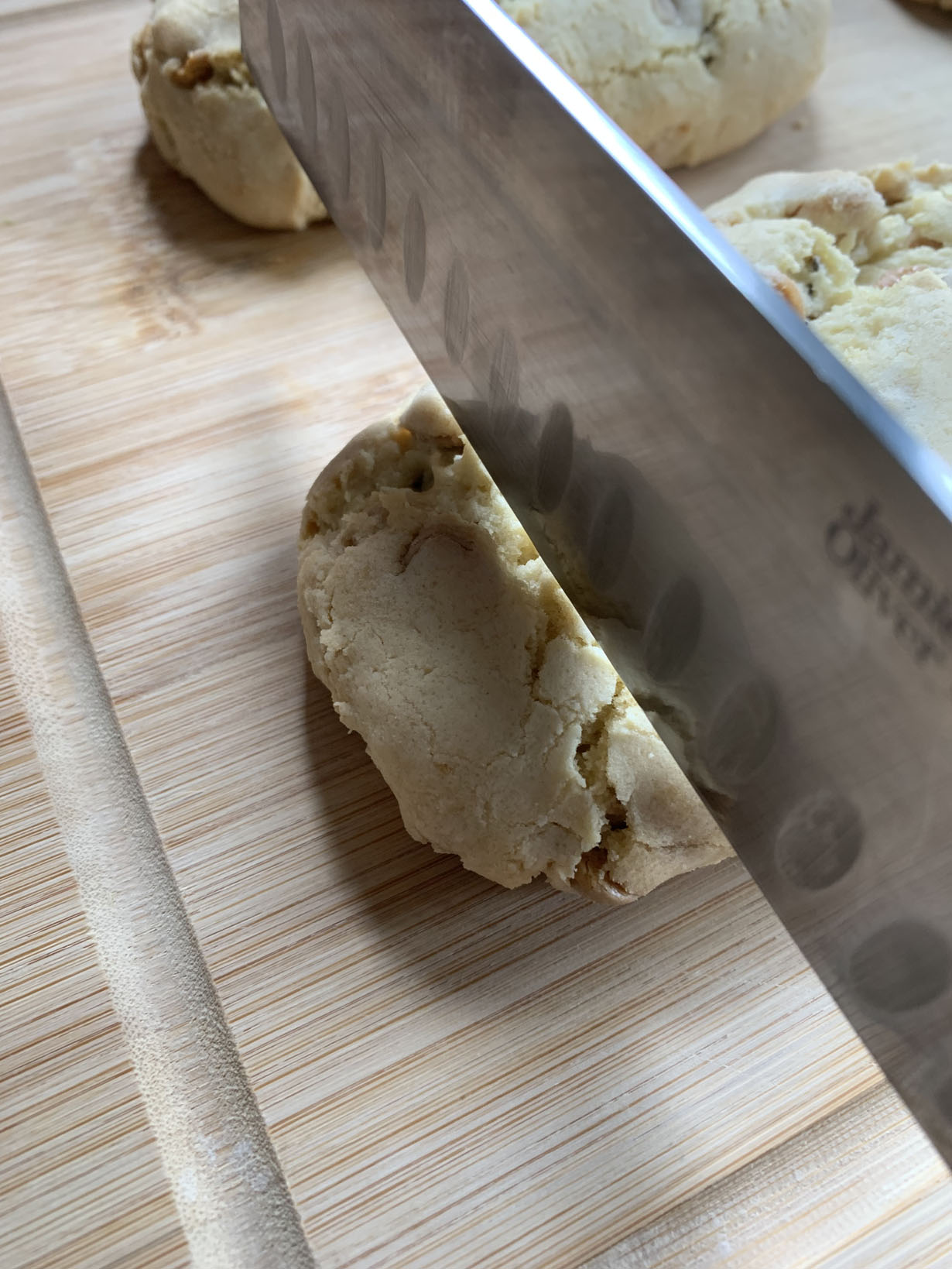 Use your hands to shape the dough into a log shape approximately 2” wide by 4” long. The dough does get wider as it cooks so ensure to leave sufficient space between the logs. Bake for 25 minutes and then cool in the baking sheet for 5 minutes. While still slightly warm, transfer the logs to a cutting board, and using a sharp knife, cut the biscotti into 1” pieces. Place the biscotti with the cut side down back onto the baking sheet. Reduce oven to 300°F and bake for an additional 8 to 10 minutes or until crisp on the outside.
