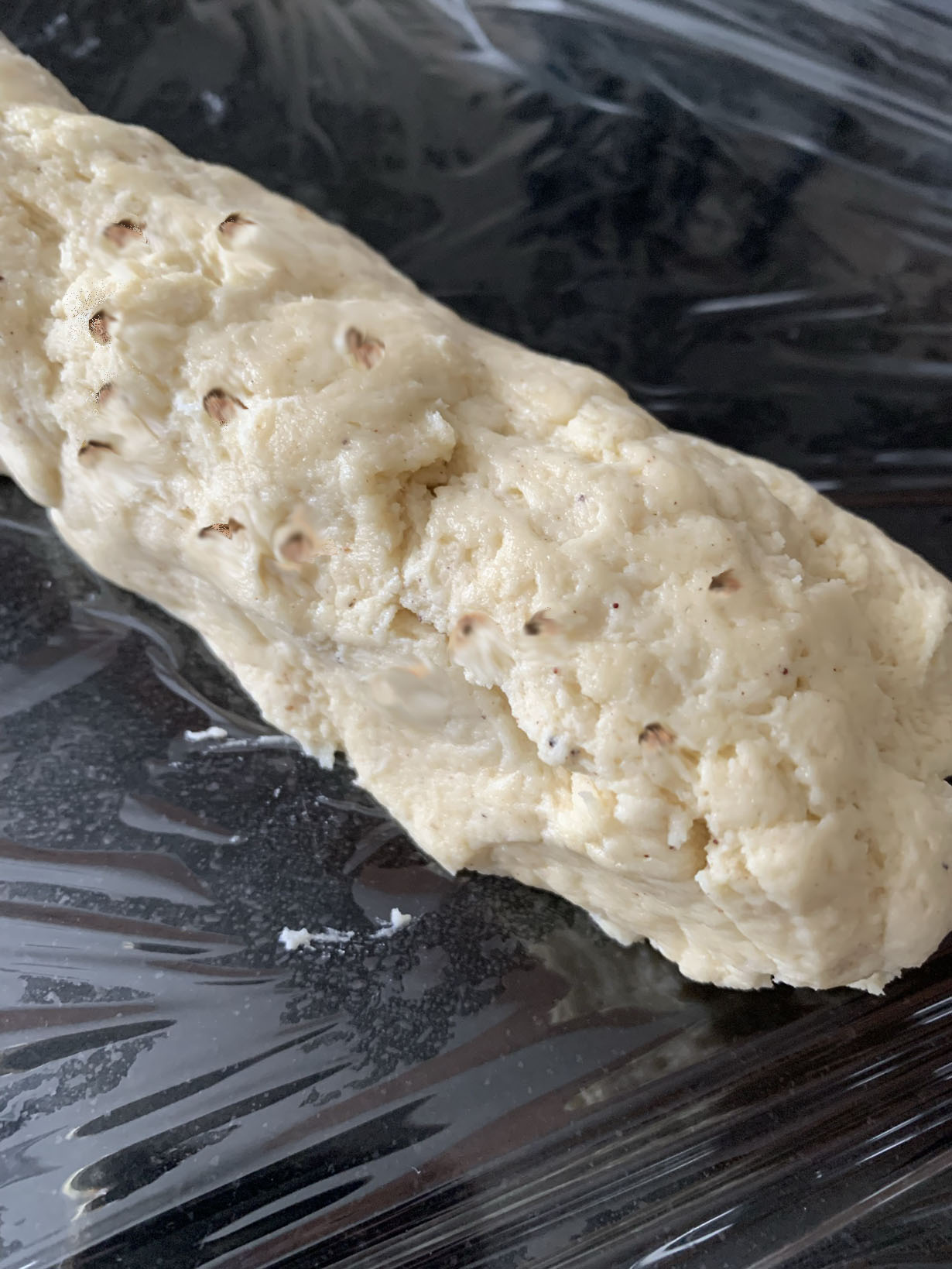 Using a tablespoon, drop the dough onto a sheet of plastic wrap in a straight line to form a 2” by 6” log. Wrap the plastic around the log shape. Roll the wrapped dough on the counter pushing outwards until the roll is even and a bit narrower and longer. Seat the edges and refrigerate the dough rolls for 1 hour.