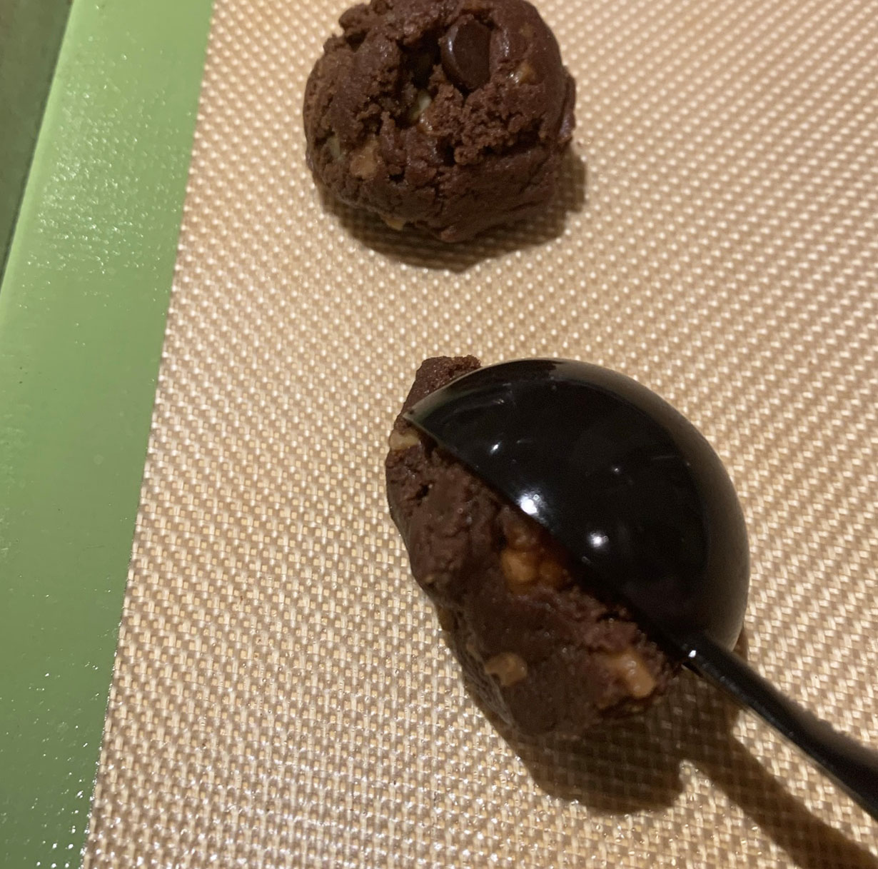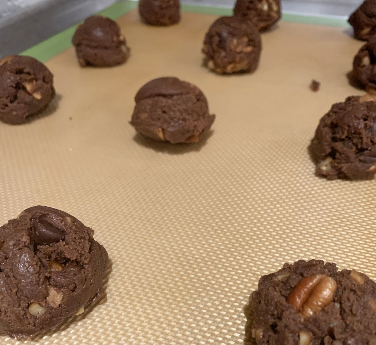 Preheat your oven to 350°F and line your cookie sheet with parchment paper or a silicone mat. Sift the flour, baking soda, cocoa powder, and salt in a bowl and set aside. In a mixing bowl fitted with the paddle attachment, add the butter and sugars and beat on high until light and fluffy. Turn the mixer to medium and add the eggs one at a time followed by the vanilla extract. Beat for another 1 to 2 minutes. Fold in the flour mixture and until most of the flour has been absorbed. Return it to the mixer and blend for another 3 to 4 rotations. Stir in the chopped pecans and chocolate chips.