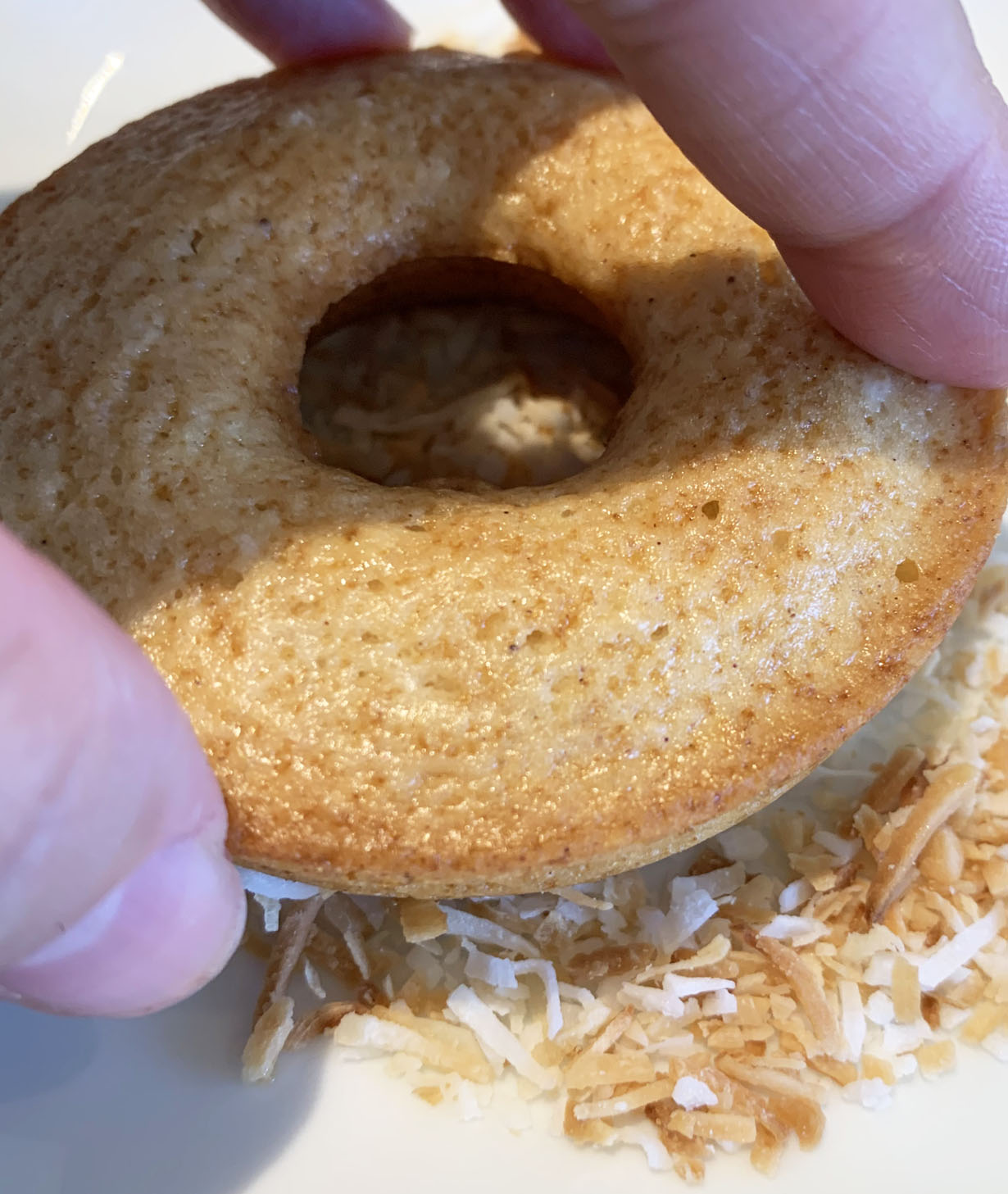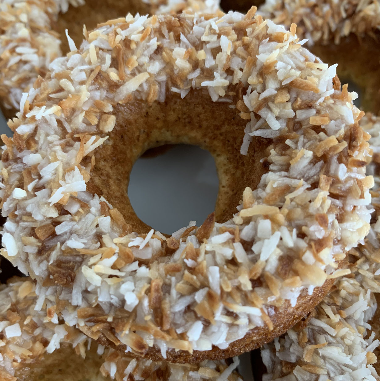 Dip the donuts into the glaze on one side and immediately dip into the coconut flakes (the flakes will adhere to the wet glaze).