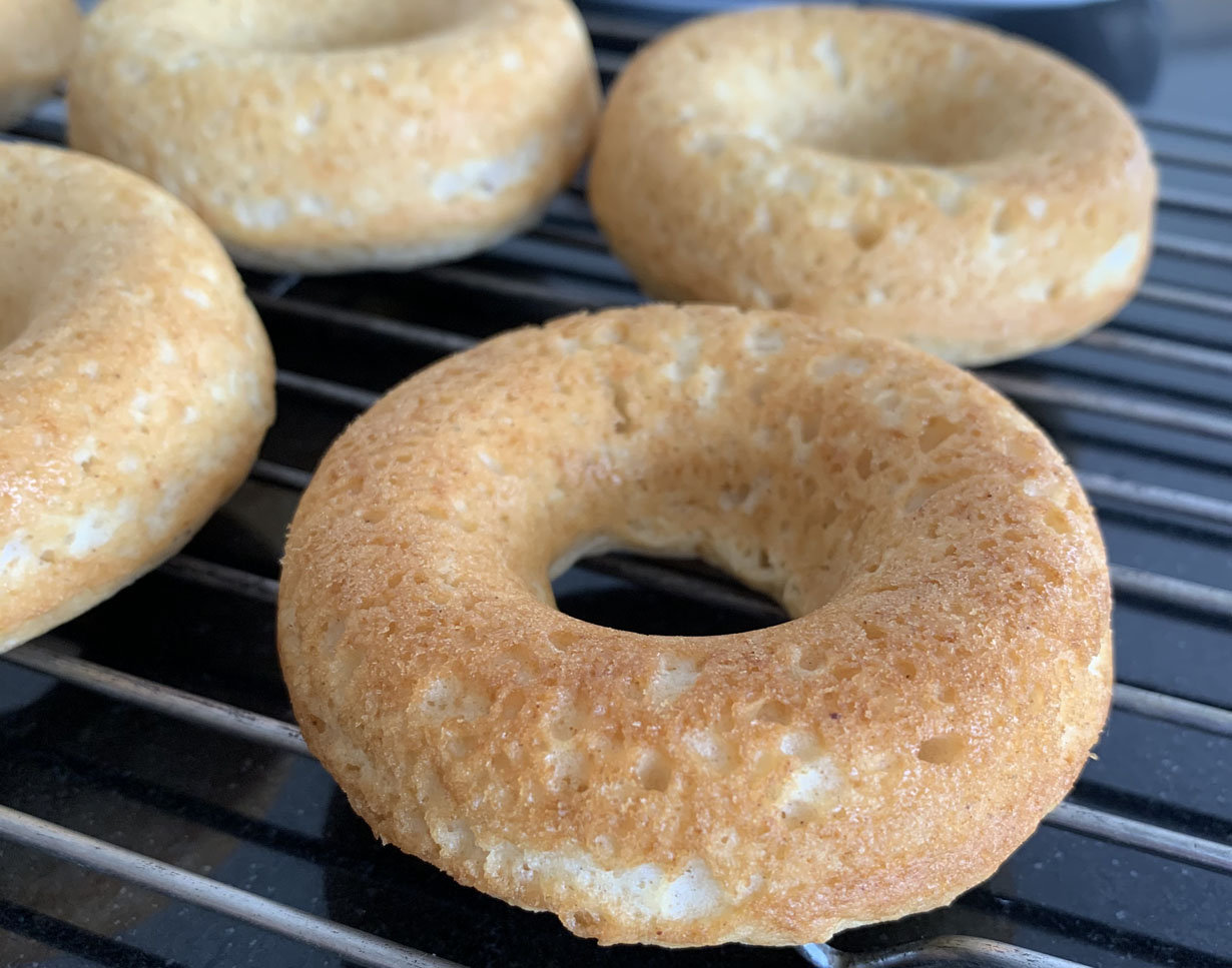Bake for 17 minutes or until a toothpick comes out clean. The donuts should be a golden brown colour. Allow the donuts to rest in the pan for 5 minutes and then tap them onto a wire rack. While the donuts are cooling, toast the coconut flakes for 2 to 3 minutes until golden brown. Mix together the icing sugar, lemon juice, extract and water until smooth.