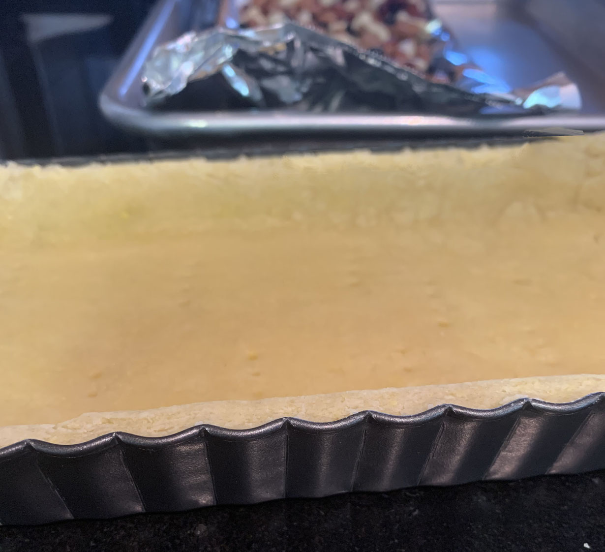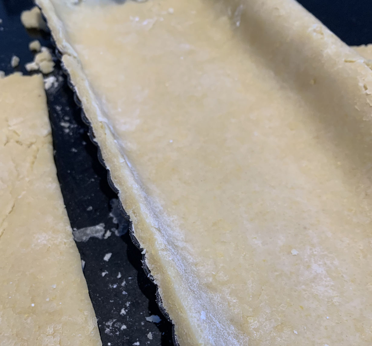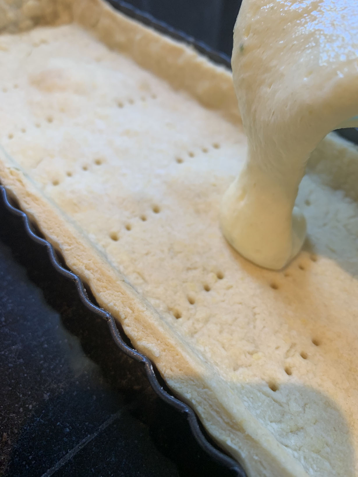 Turn the dough onto a floured surface and roll out to fit past a 4” x 14” rectangular flute pan. Roll over your pin and place over the pan to cover it. Press into the pan and using a sharp knife, cut around the trim discarding the excess pastry. Use a fork to prick the base. Chill the dough for 30 minutes before baking.
