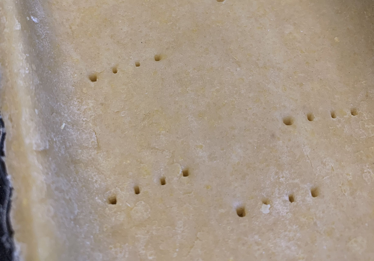To bake, cover the dough with silver foil and blind bake with beans for 10 minutes. Remove the foil and beans and continue to bake for 10 minutes more.