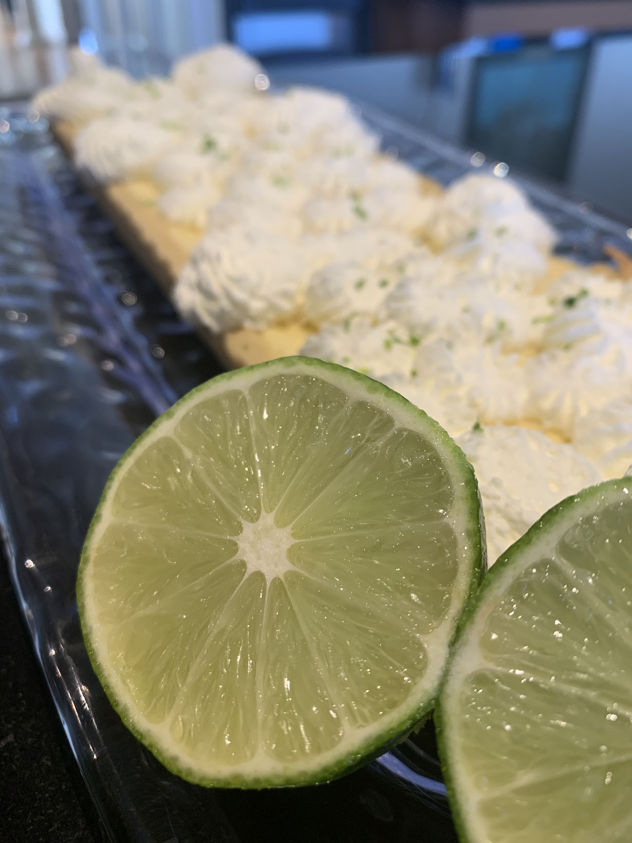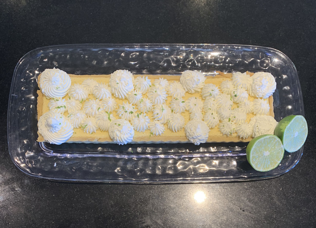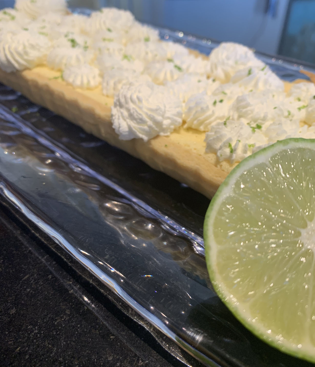 This classic American dessert is made in a rectangular tart pan for added flair. Using tart limes, it makes you want to sit next to a beach eating it. The pie shell is made with eggs, bringing to mind a cookie rather than a pie shell. The end result looks like a store bought dessert that will impress your friends and family!
