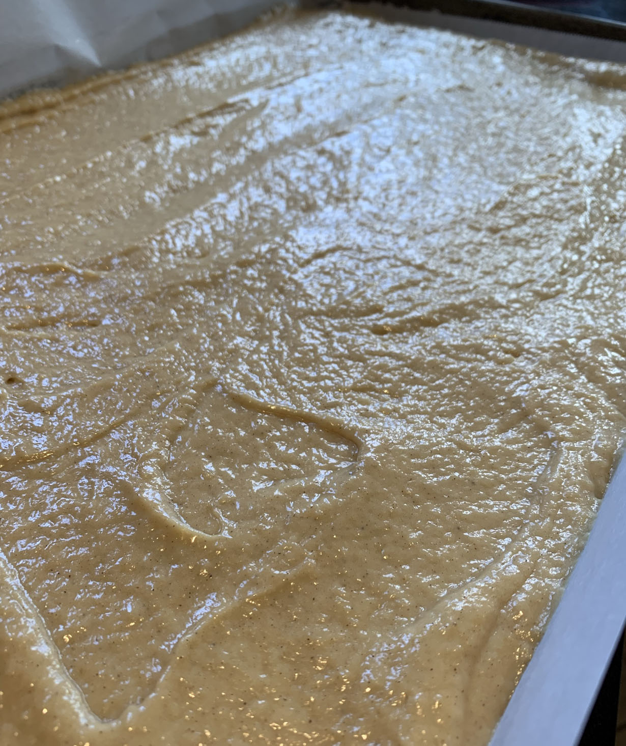 Next prepare the cake. Preheat the oven to 350°F and line a baking sheet with parchment paper. Sift the flour, baking soda, and salt and set aside. In a separate bowl, mix together the sugar with the spices until well combined. Reserve 2 tablespoons of the sugar. In a stand mixer combine the apple sauce, melted butter, apple cider, egg, and vanilla extract. While beating, slowly add the cinnamon sugar mixture. Add the flour mixture and beat on low speed until incorporated. Spread the mixture onto the baking sheet, evening the top. Bake for 25 to 35 minutes or until a toothpick inserted in the middle comes out clean.