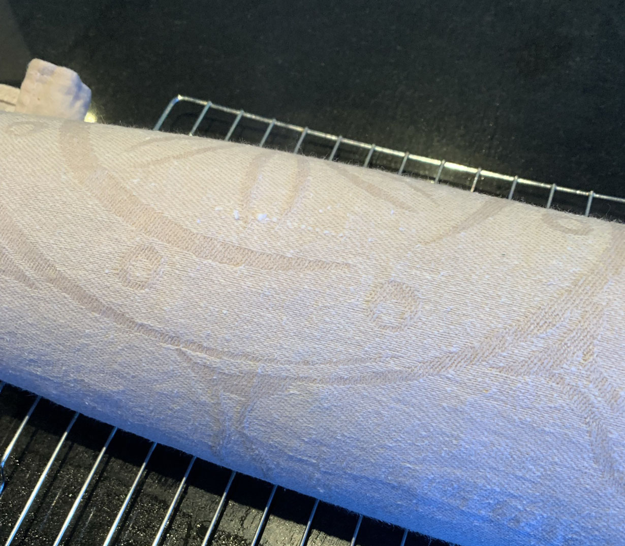 While the cake is baking, dampen a tea towel with water and sprinkle the reserved sugar onto the towel. Remove the cake from the oven and flip over the cake onto the tea towel while it is still warm. Fold over the end of the tea towel and continue to fold the towel ends to create a roll. Although this method is usually reserved for making a cake roll, doing this allows you to make pinwheels for your trifle as the cake is not flat and has the bend required. Allow the cake to completely cool while rolled.