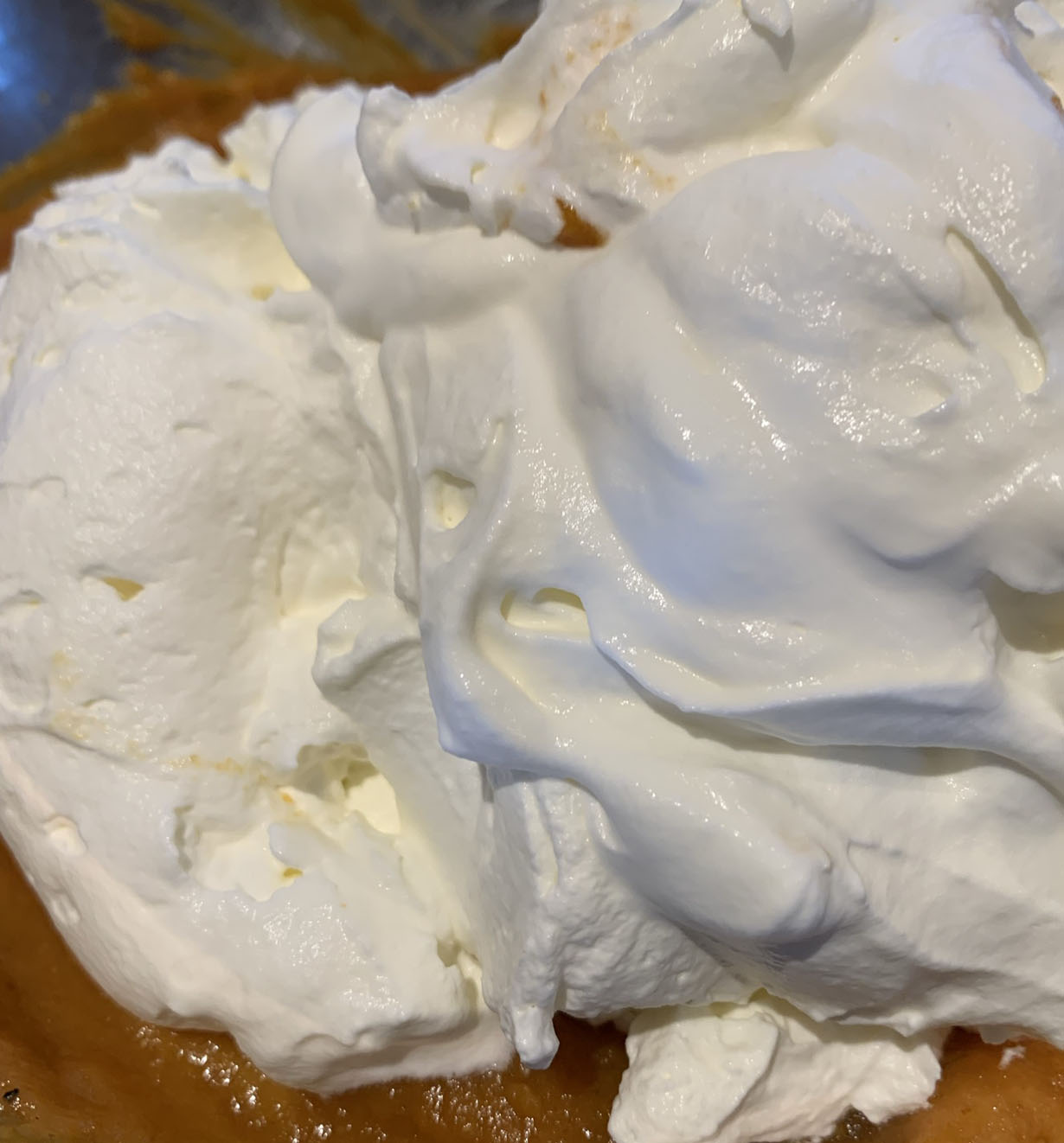 In your mixing bowl, combine the pumpkin, sugars, egg yolks, orange zest, vanilla, and spices. Add the gelatin mixture. Beat the cream to form stiff peaks and fold into the pumpkin mixture. Refrigerate until you are ready to assemble the trifle.