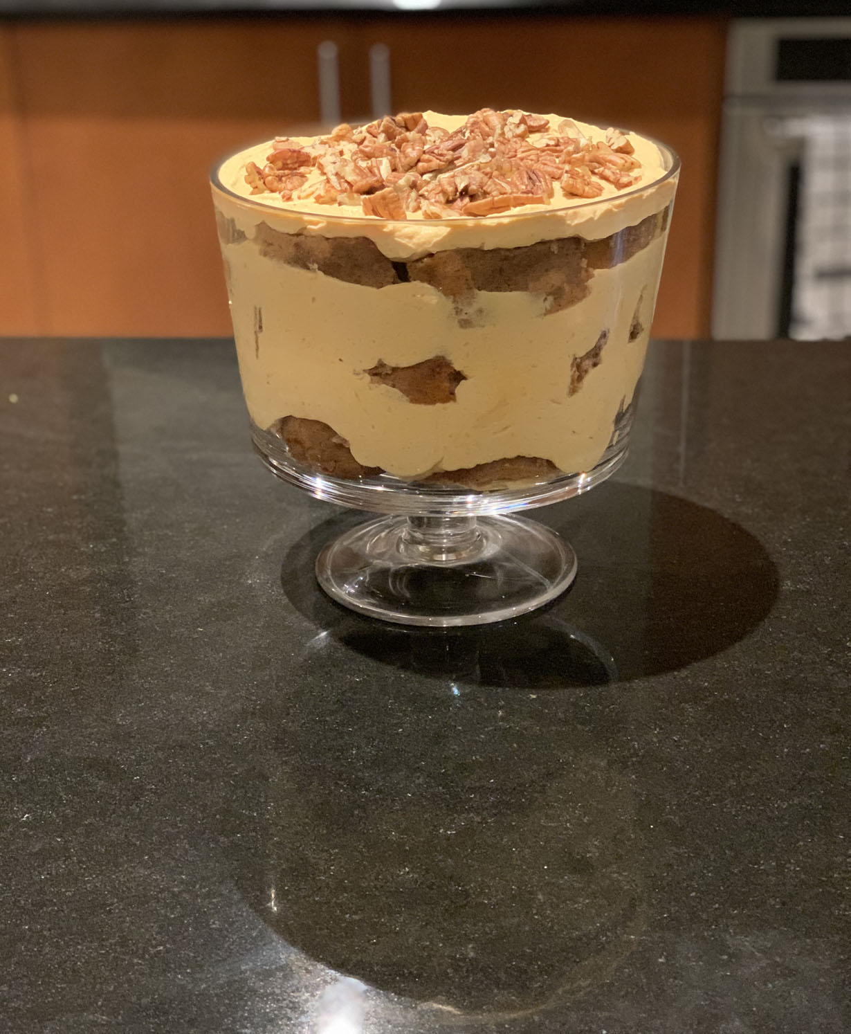 To assemble the trifle, unroll the cake and cut into 4 equal strips to create a 4” x 12” strip with a slight bend in it. Fill the cavity with some of the pumpkin mousse and fold over the small roll. Cut the roll into 7 even pieces and place cut-side down into the trifle dish. Cover with a layer of pumpkin mousse followed by a layer of pecans. Repeat until the trifle dish is full.