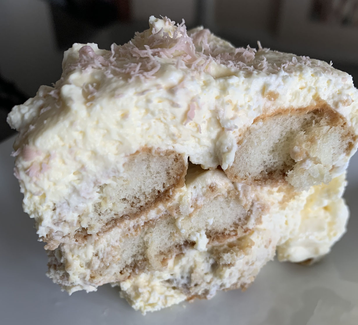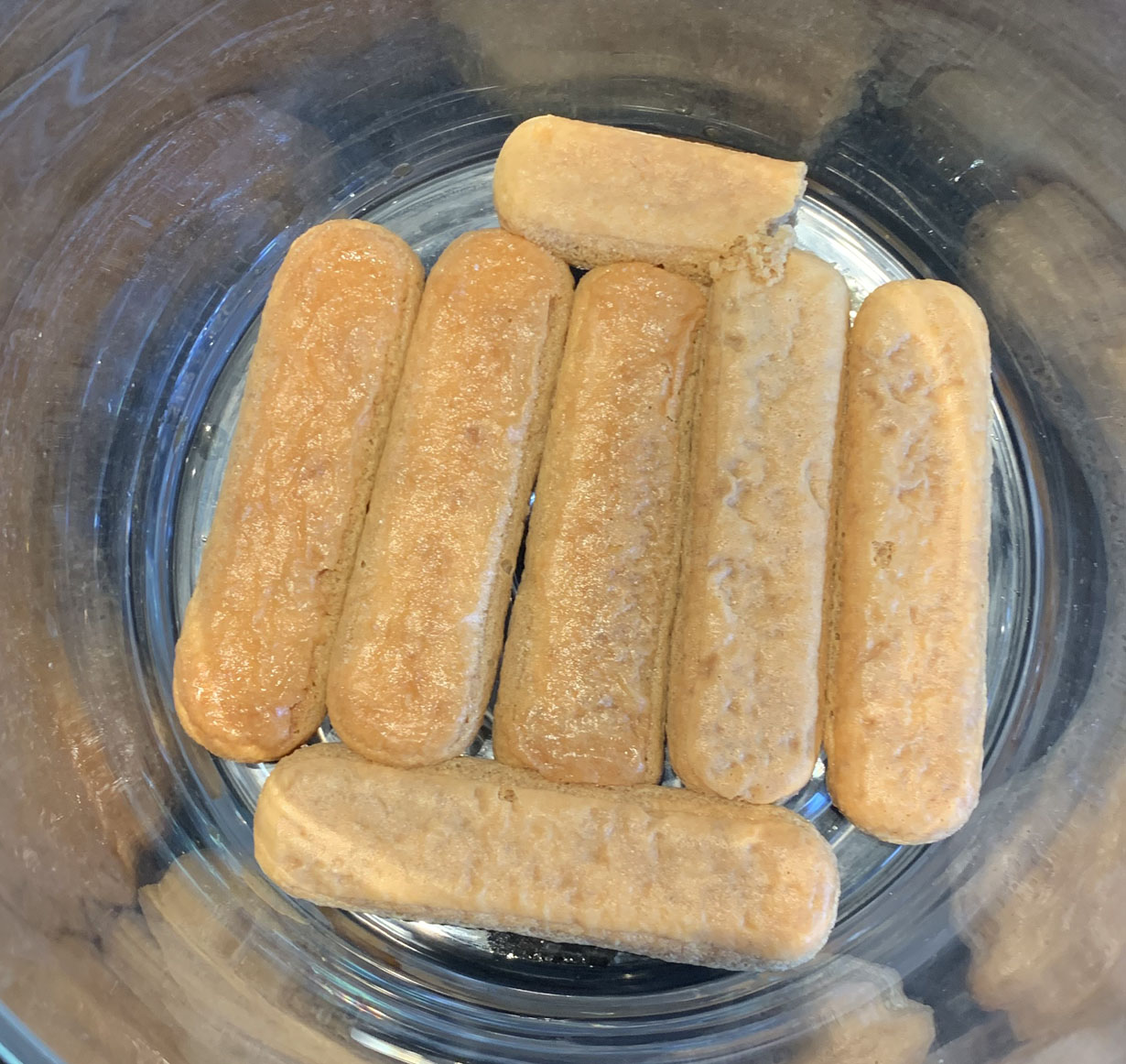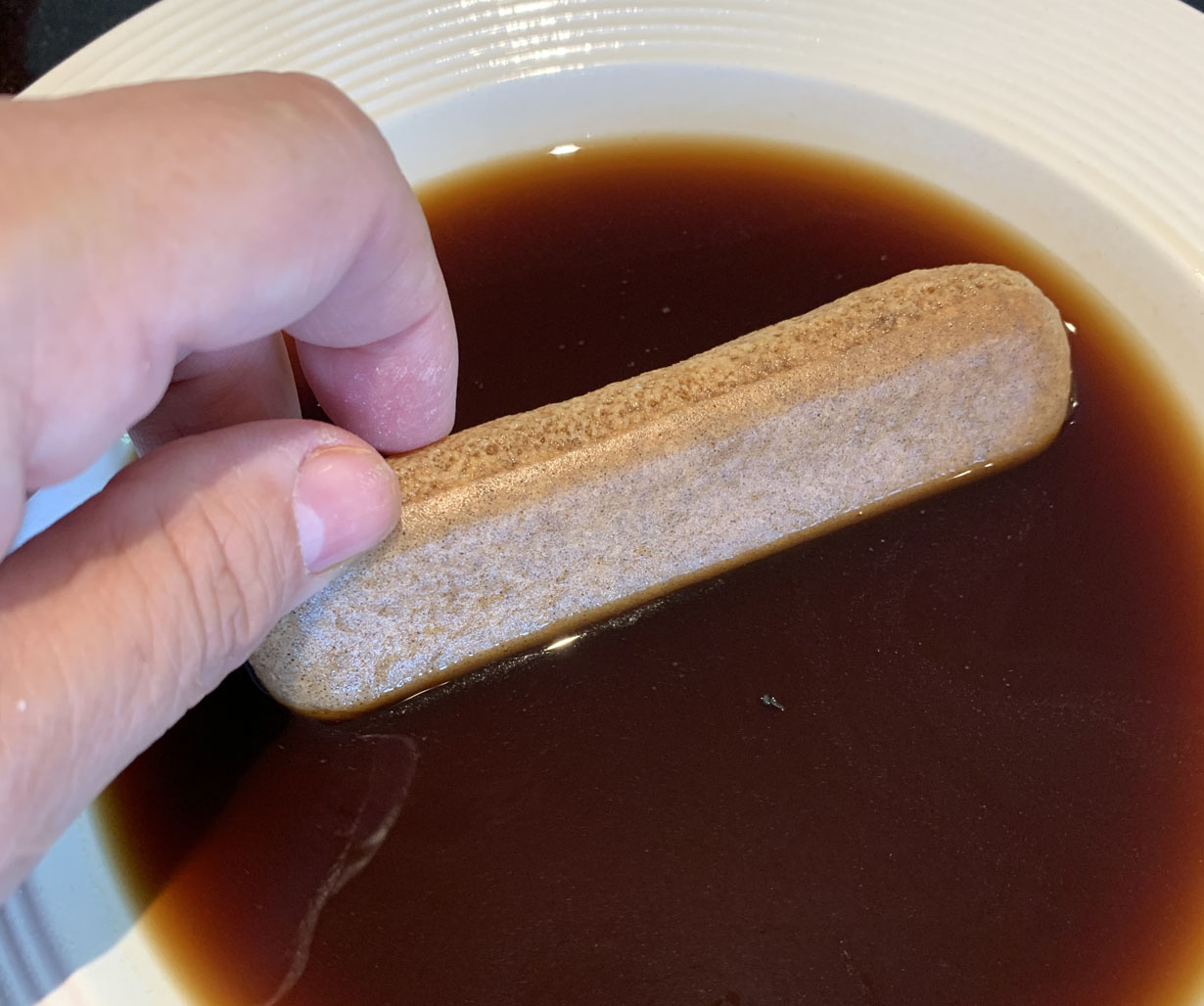 Dip the lady fingers into the cooled coffee on both sides and layer on the bottom of a trifle dish. Cover the lady finger biscuits with the mascarpone mixture. Repeat with another layer of lady finger biscuits and before adding the mascarpone mixture, drizzle with the melted chocolate. Add the final layer of lady finger biscuits and cream and garnish with shaved rose chocolate. (Note: store bought Italian lady fingers are much crunchier than homemade and hold up better to soaking).