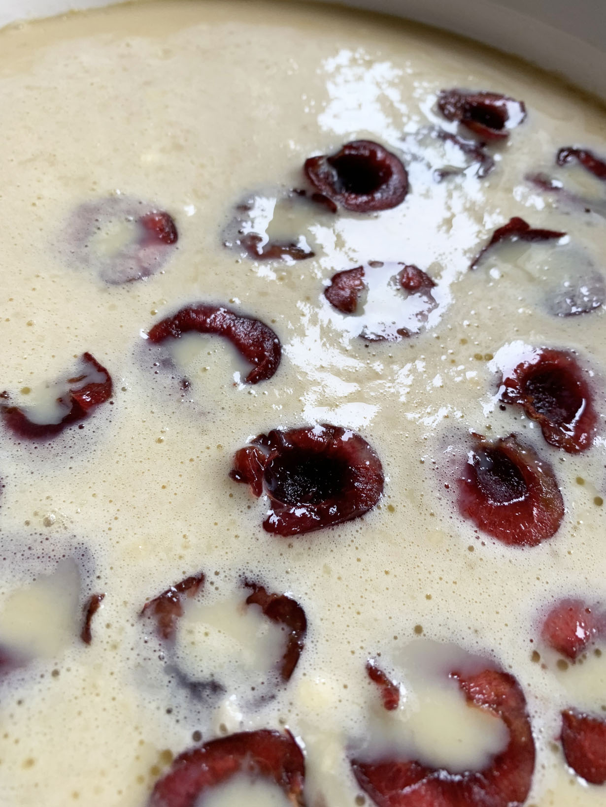 Pour the batter into the prepared baking dish and bake for 10 minutes to allow the edges to bake. Remove from the heat temporarily and add the sliced cherries. Sprinkle the top with the remaining sugar.