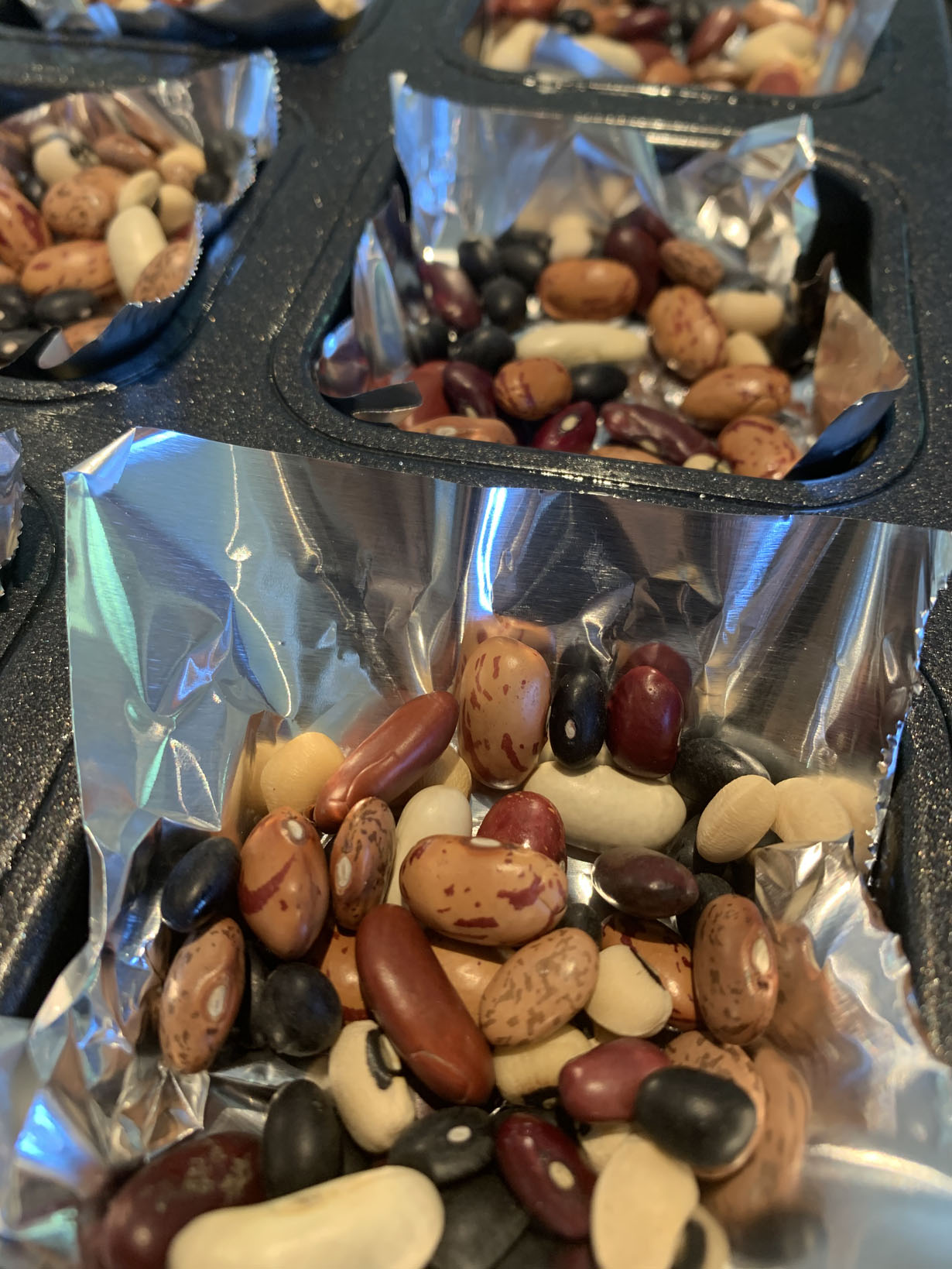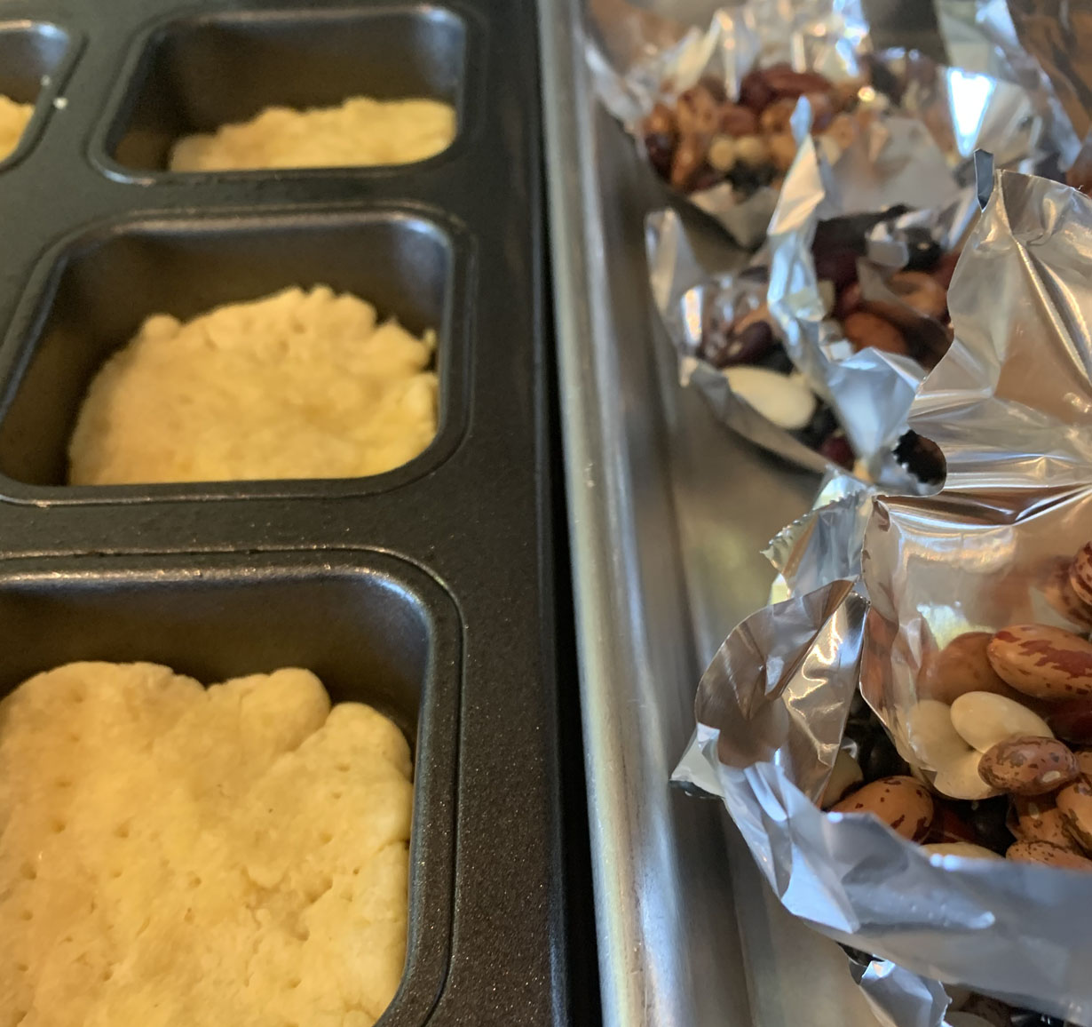 Shape the cookie dough into small balls to fit into a square shaped muffin pan. Using your fingers, press down the dough to cover the bottom surface. Chill the dough for 30 minutes before baking. To bake, cover the cookie dough with silver foil and blind bake with beans for 5 minutes. Remove the foil and beans and continue to bake for 5 minutes more.