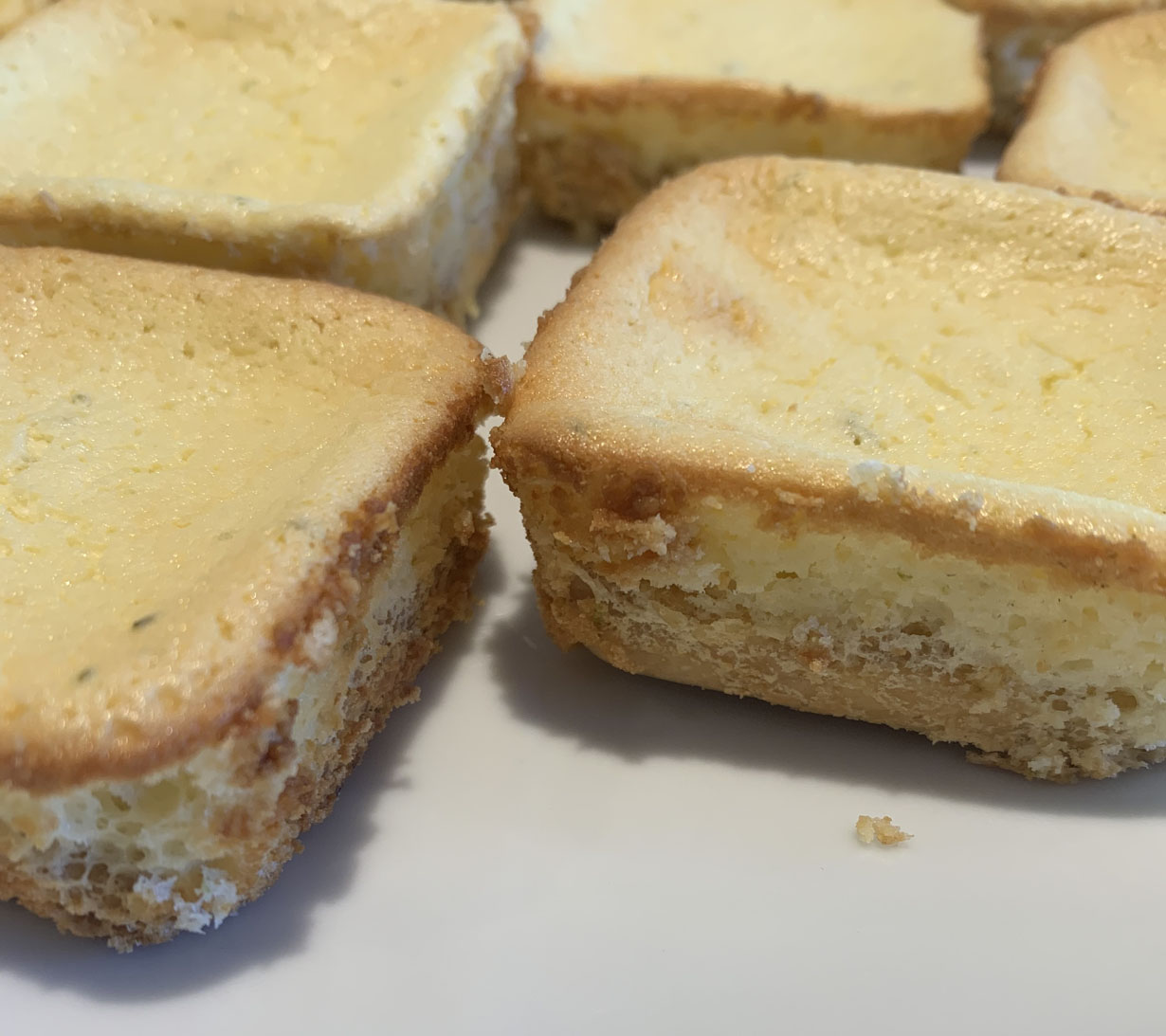 Lime custard rests on an individual cookie base for a tangy, yet buttery dessert. Dusted with confectioners’ sugar and toasted almonds, it is sweet, smooth and crunchy all at the same time.