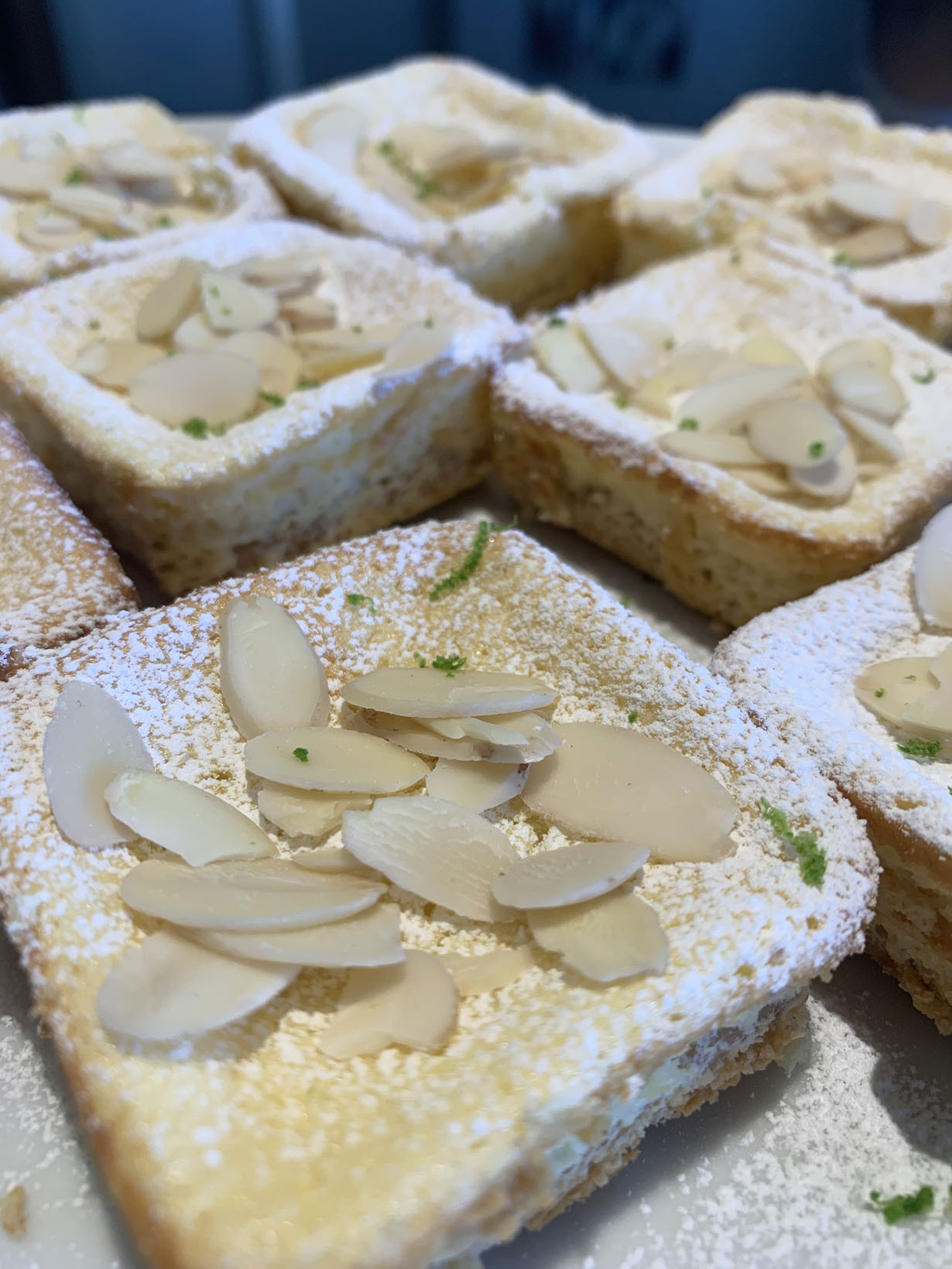Add in the icing sugar through a sifter to avoid clumps. Sprinkle lime rind and almonds on top.