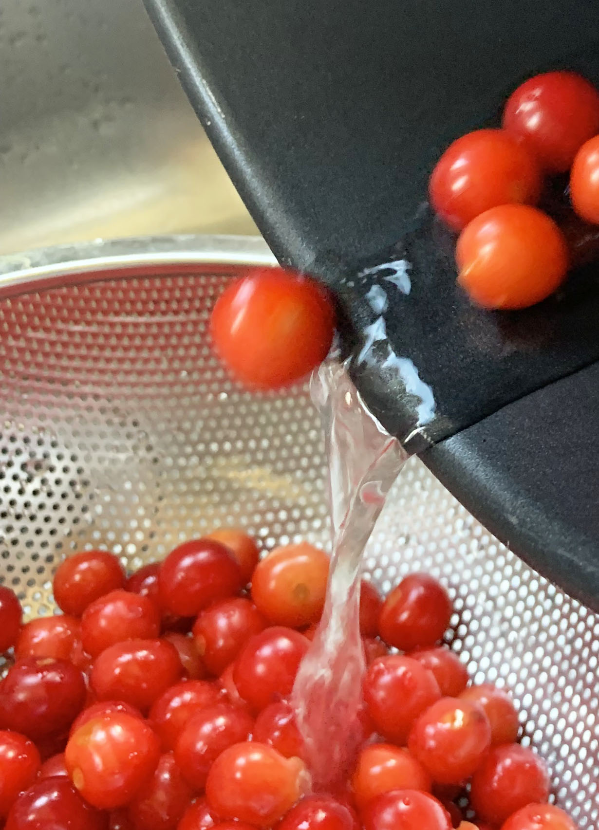 Boil the sour cherries in water for 10 minutes. Drain into a sieve. Using the back of a large spoon, press the cherries through the sieve, leaving the cherry juice. Some pulp may make it through, but this will be removed after the syrup is reduced.