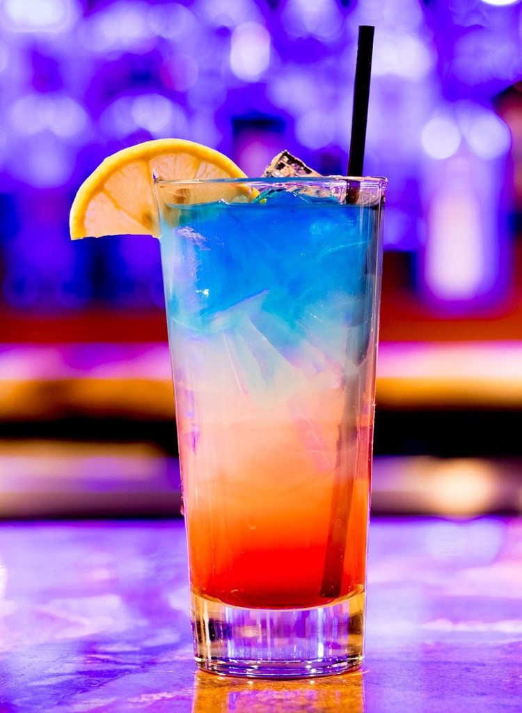 Mix grenadine with visinada and add to a glass. Fill six glasses with ice. In a shaker, shake the lemonade and the vodka then gently pour the mixture over the back of a spoon equally into the six glasses creating the white layer of the drink. Cascade 1 oz of the blue curacao over the back of a spoon to make the final blue layer. Makes 6 drinks.