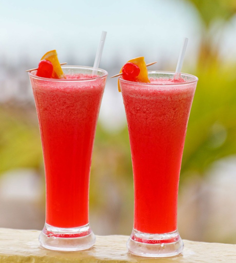 In a blender, liquify the watermelon. Add the ice, visinada and vodka. Add ice and crush to a slushie consistency. Garnish with lemon slice and maraschino cherries. Makes 6 drinks.