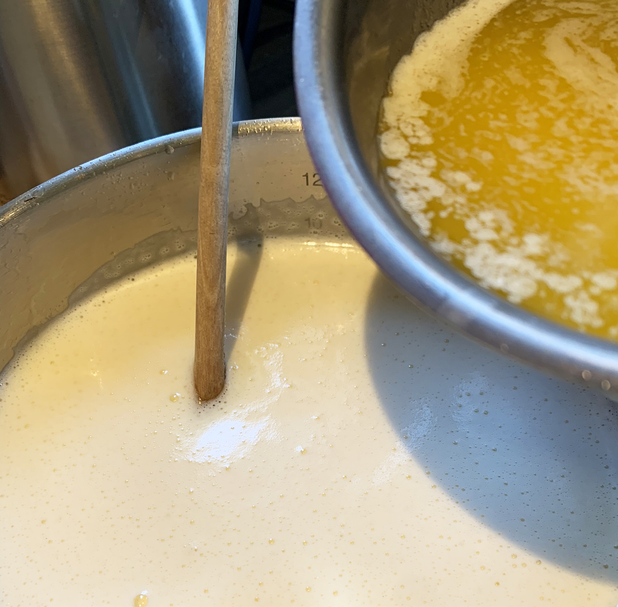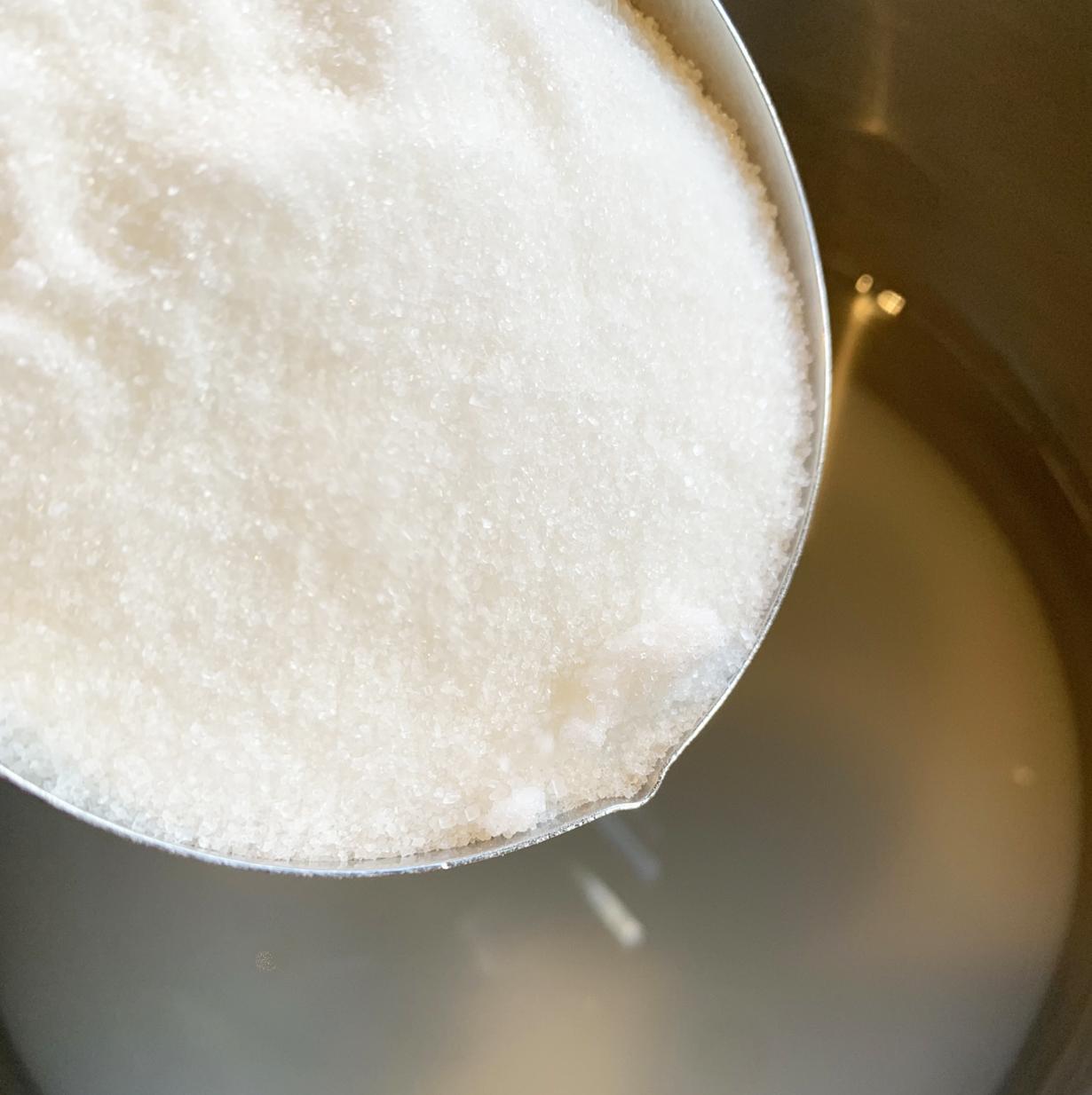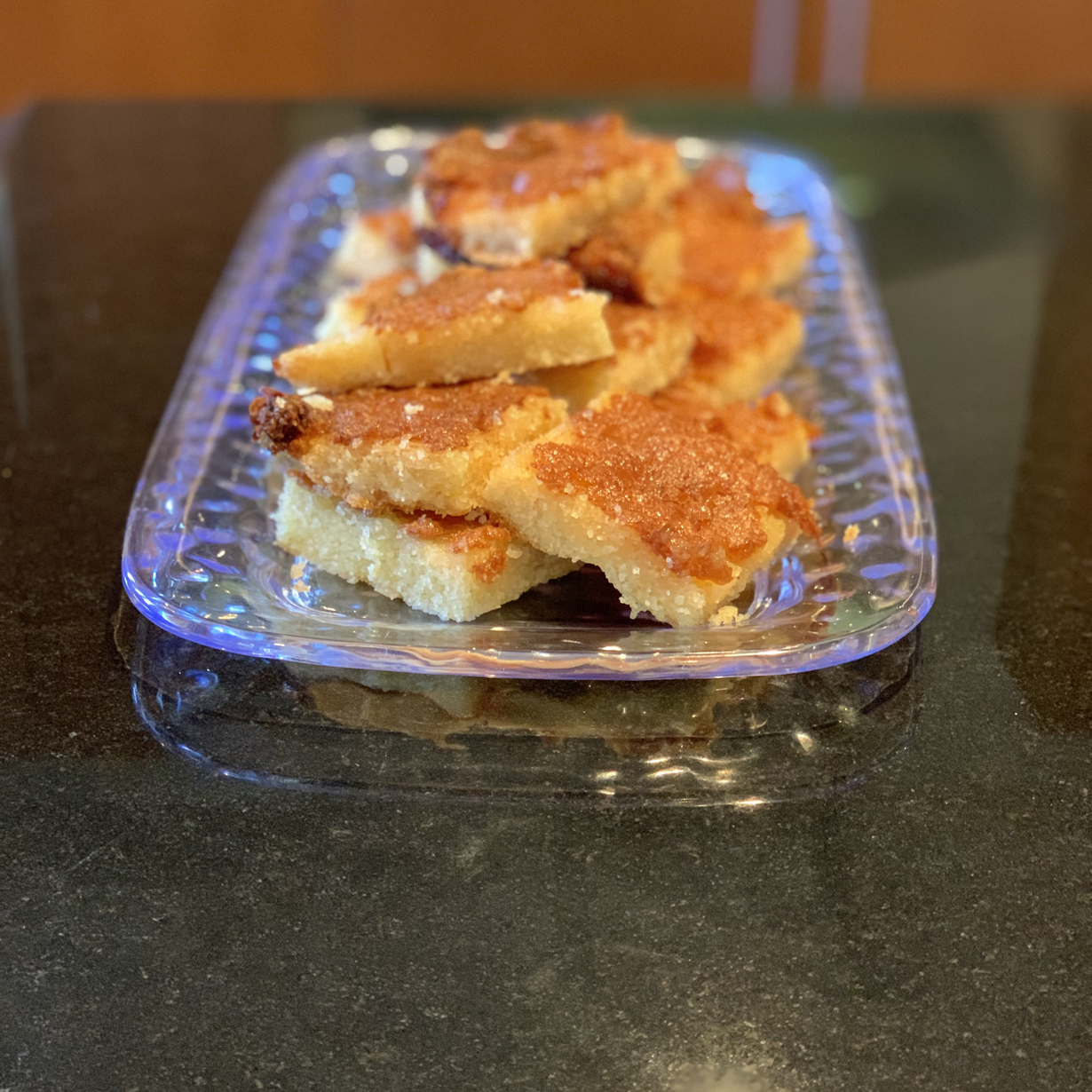Preheat the oven to 350°F and spray a 9” x 14” baking pan with non-stick spray. In a pot, bring the sugar, lemon juice, and water to a boil. Continue to cook until it makes a simple syrup. Melt the butter while making the syrup and set it aside.