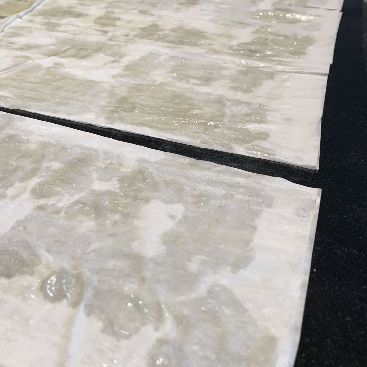 Make sure you have a large surface to work on when preparing the phyllo. Wet a thin dish towel and squeeze out the liquid so it is just damp. Remove the phyllo pastry from the packaging and cover with the damp towel to keep it from drying out. Take one sheet of phyllo pastry and brush with the melted butter. Take a second sheet of phyllo pastry and, as closely as possible, place on top of the first sheet. Brush this layer with butter again. Using a very sharp knife, cut the phyllo pastry into 3 equal pieces.