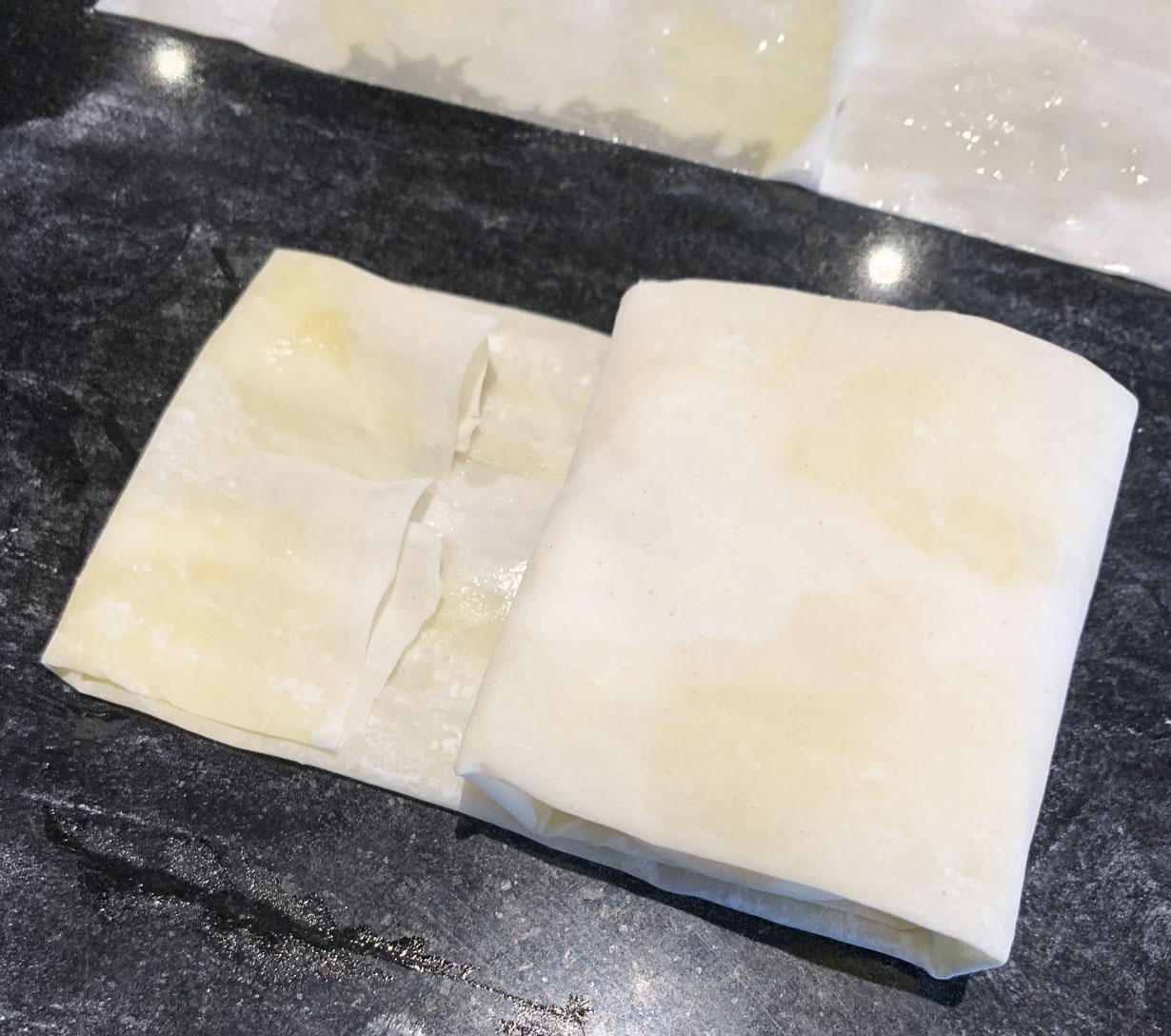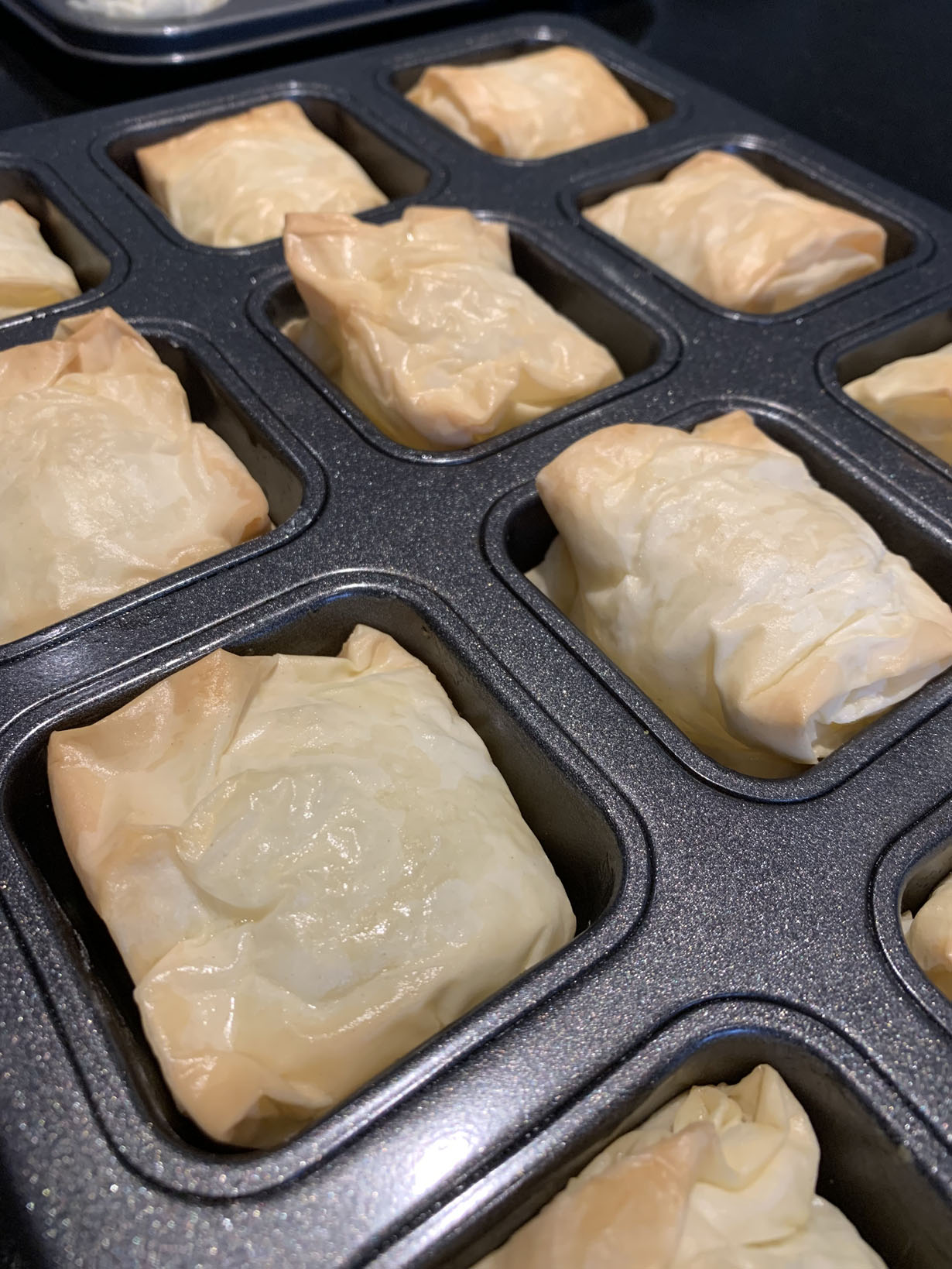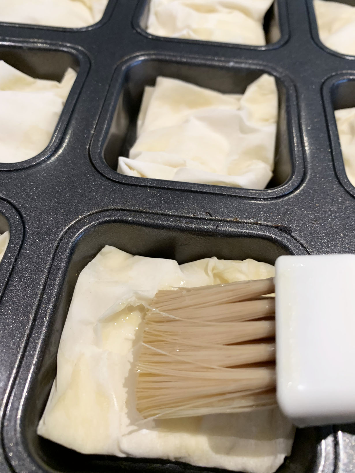 Fold the long edges from the cut pieces in about 1/2” on each side. Place two heaping tablespoons of the custard at one end of the piece and fold over to create a 2” size. Continue to fold over until you reach close to the end. At the other end, fold over the end so that it is a clean edge. Place the bougatsa bite into buttered square tart pans with the last folded edge facing down (or use a baking sheet lined with a silicone mat and place the bites 1” apart). Brush the tops with butter.