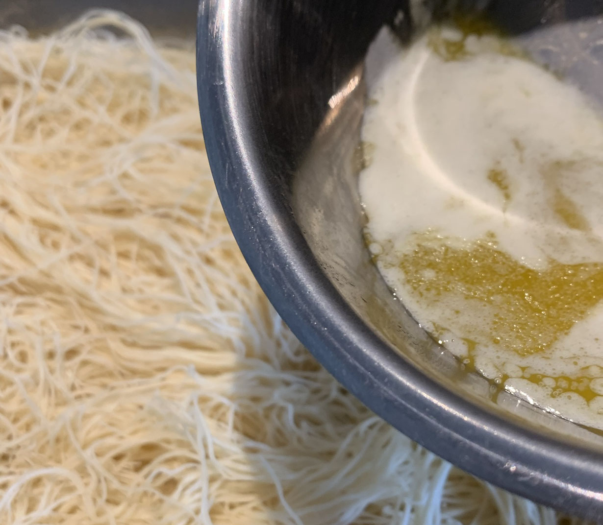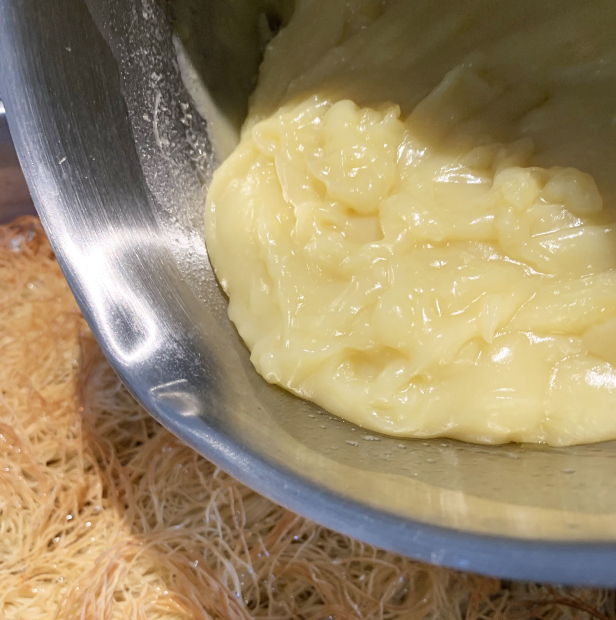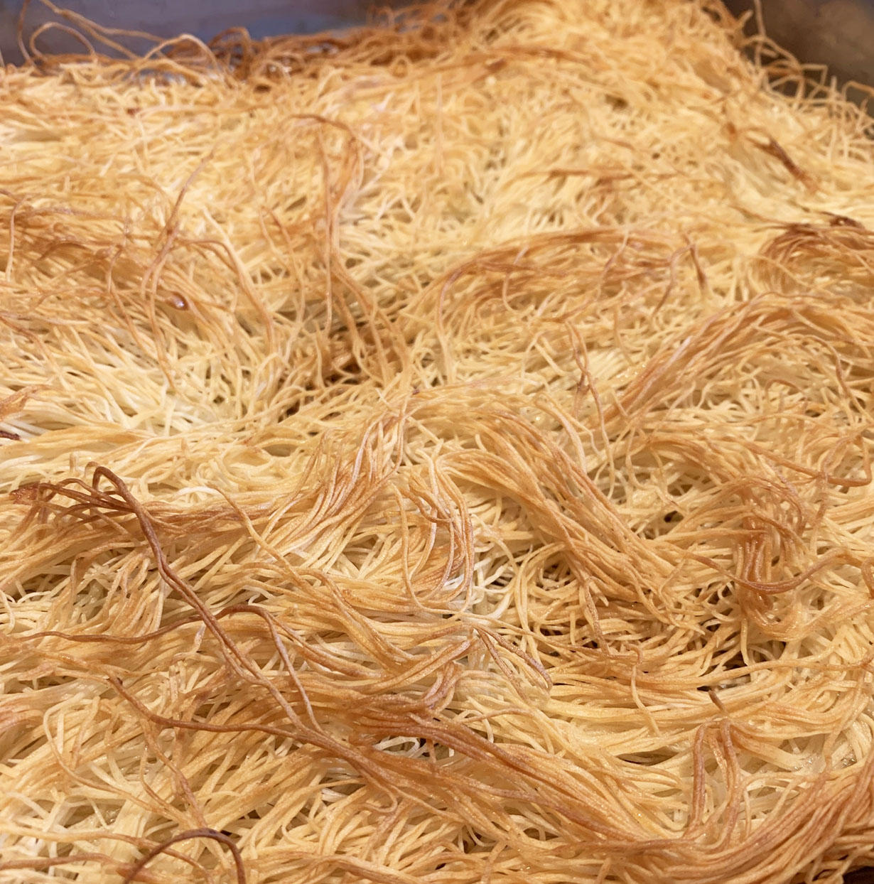 Preheat the oven to 350°F and butter a baking dish. Over the buttered baking dish, spread out the Kadaifi pastry until the entire bottom is covered. Drizzle with the melted butter and bake for 20 to 30 minutes or until golden brown. Set aside and cool completely.