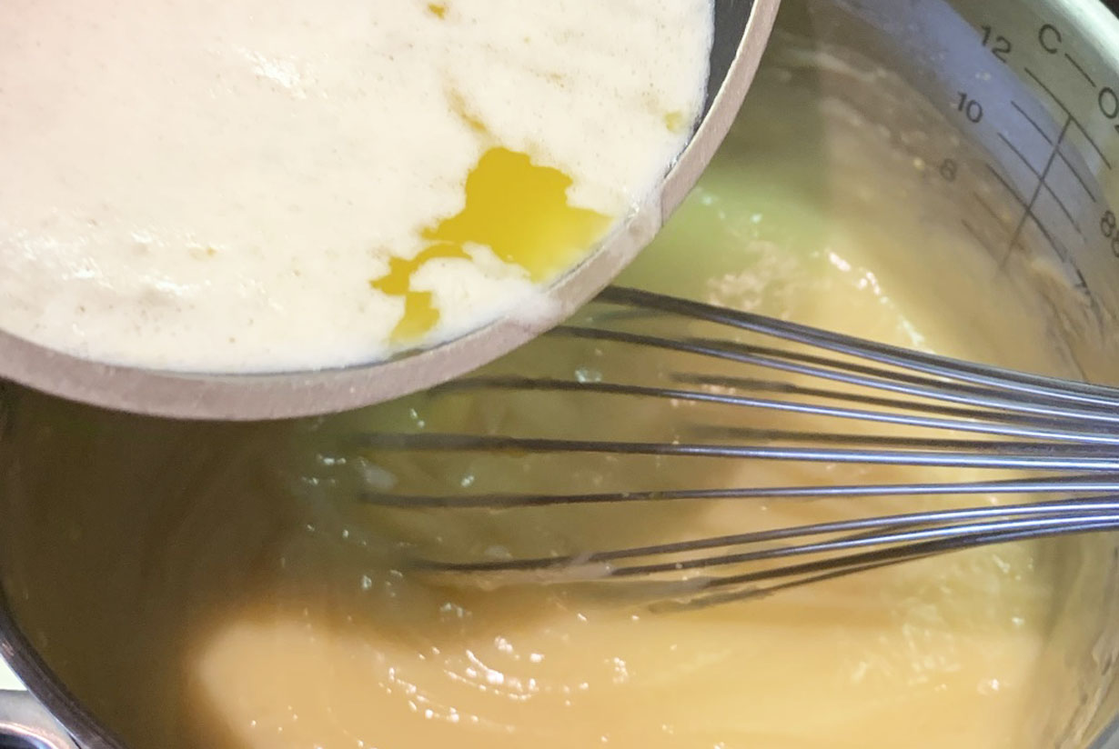 Make the custard by mixing the eggs, sugar, and flour in a pot. Combine the milk and cream and slowly pour into the egg mixture. Blend in well after each addition of the milk mixture to avoid making clumps. When all the milk has been added, place the mixture on the stove and cook over low heat until thickened. Once thick, remove from the heat and stir in the vanilla extract. Add the butter and stir continuously until all the butter is melted and incorporated into the custard.
