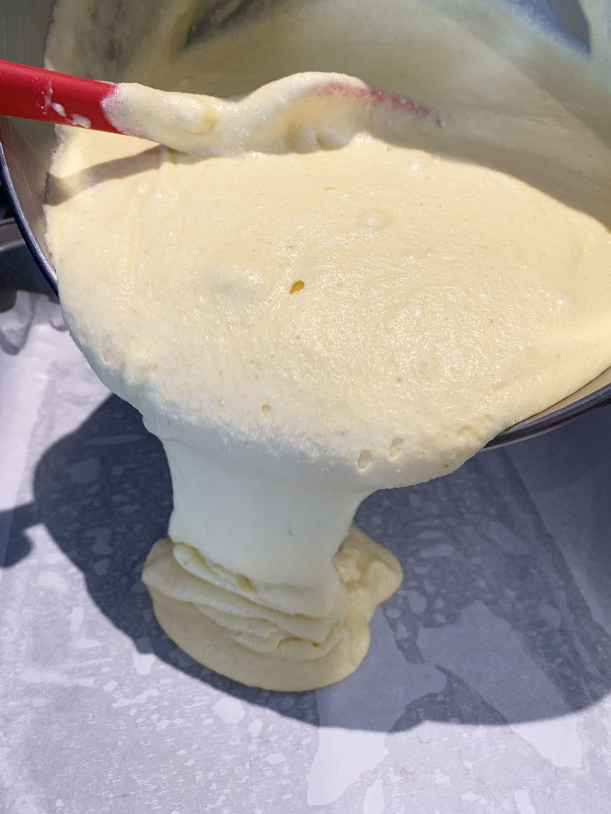 Preheat the oven to 350°F and prepare a 10” x 14” baking pan (spray with non-stick spray and line with parchment paper). Mix together the semolina, flour, and baking powder and set aside.