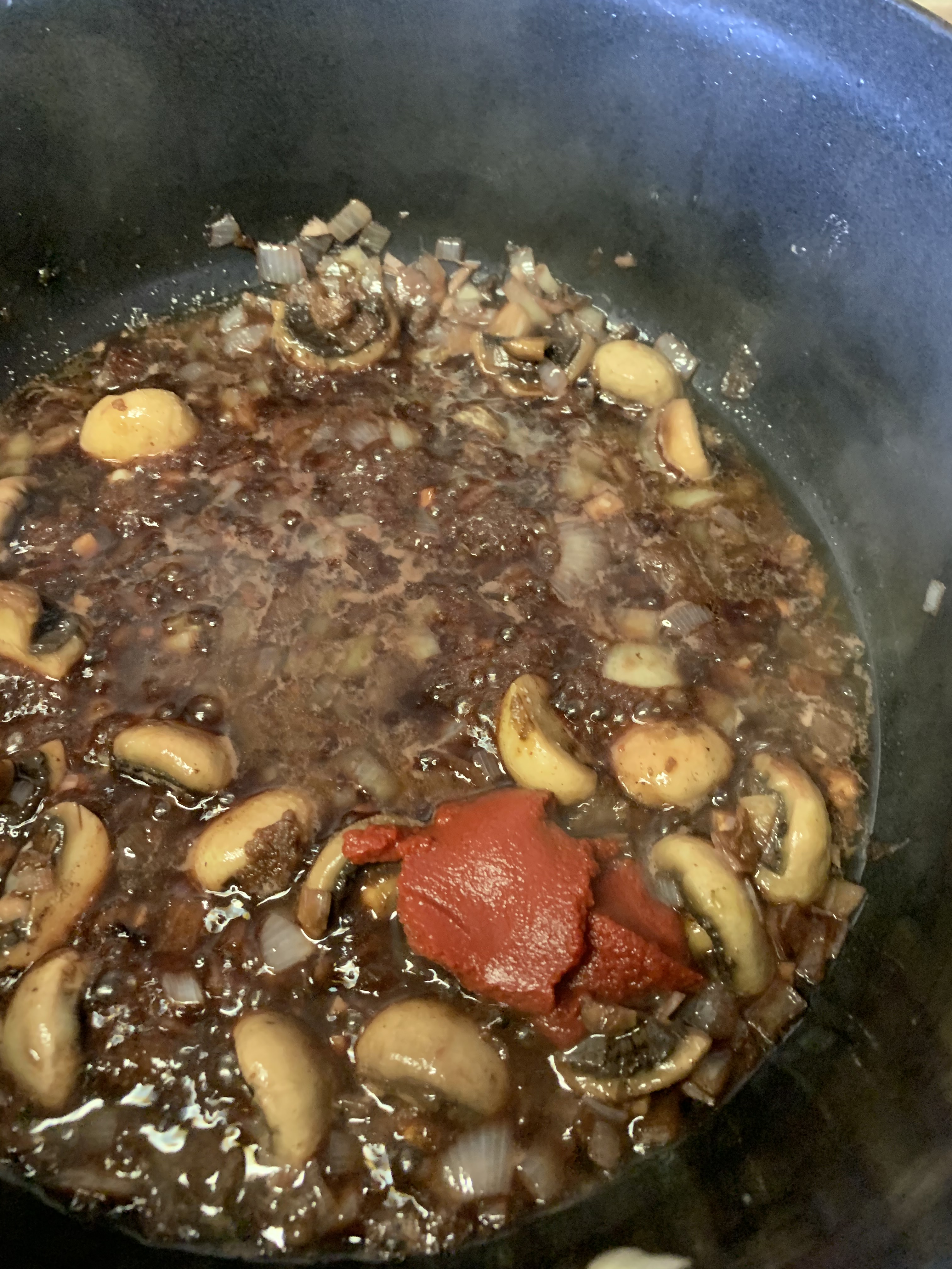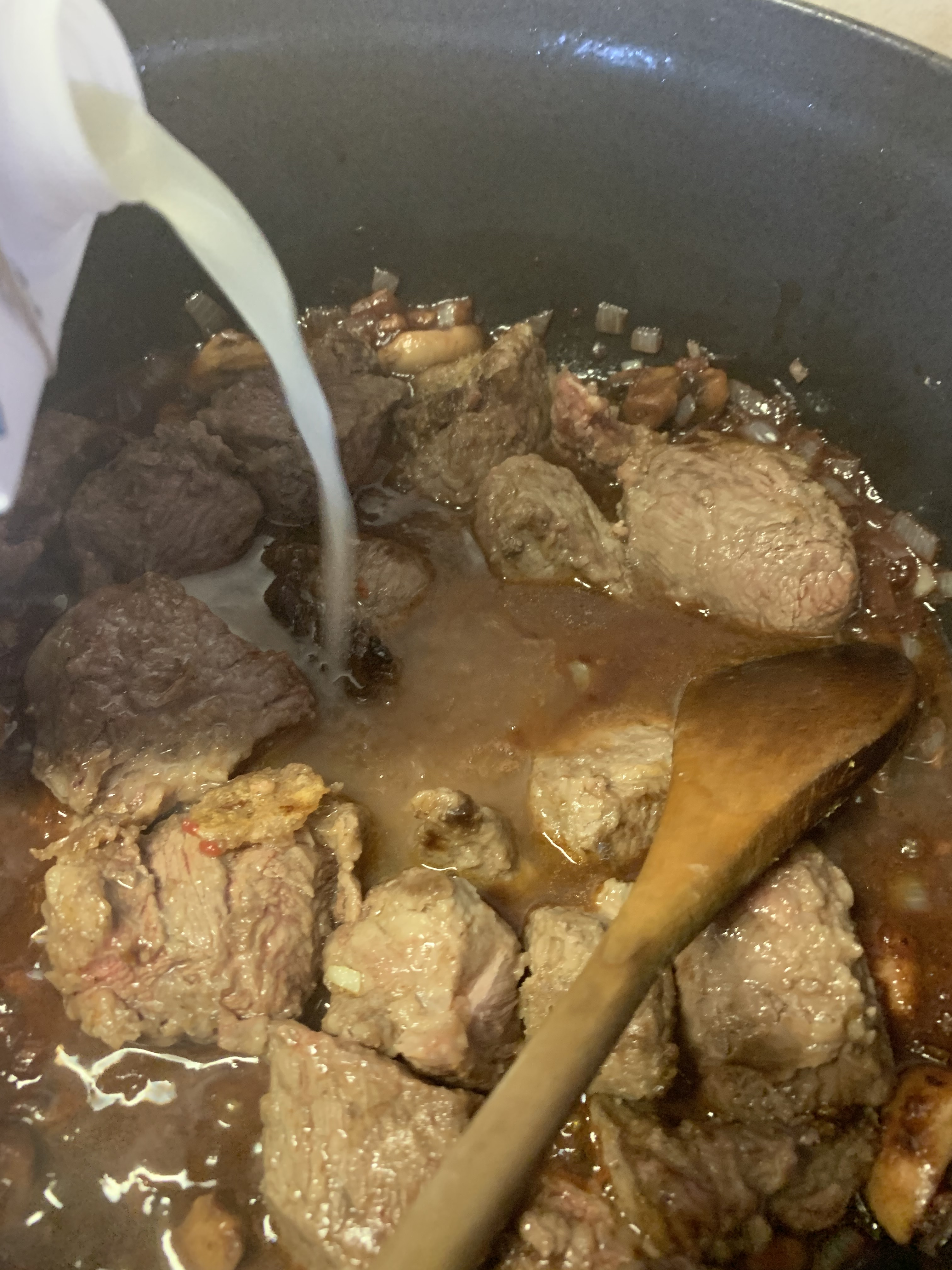 Sprinkle 1 tsp salt and the pepper into the flour. Mix well. Dust the beef pieces with the flour and set them aside. In an oven ready pot, melt the butter and fry the beef pieces until browned on all sides. Remove the browned beef and set it aside. In the same pot add the onions, garlic and mushrooms and cook for 3 minutes or until the onions are translucent. Add the wine and deglaze the pot, making sure to remove any brown bits from the meat. Reduce the wine for 3 minutes. Add the tomato paste and cook for an additional minute. Add in the meat and any juices released to the pot. Season with salt. Add the stock, cover and bring to a boil. Once the liquid is boiling, transfer the pot to the oven and cook for 2 hours.