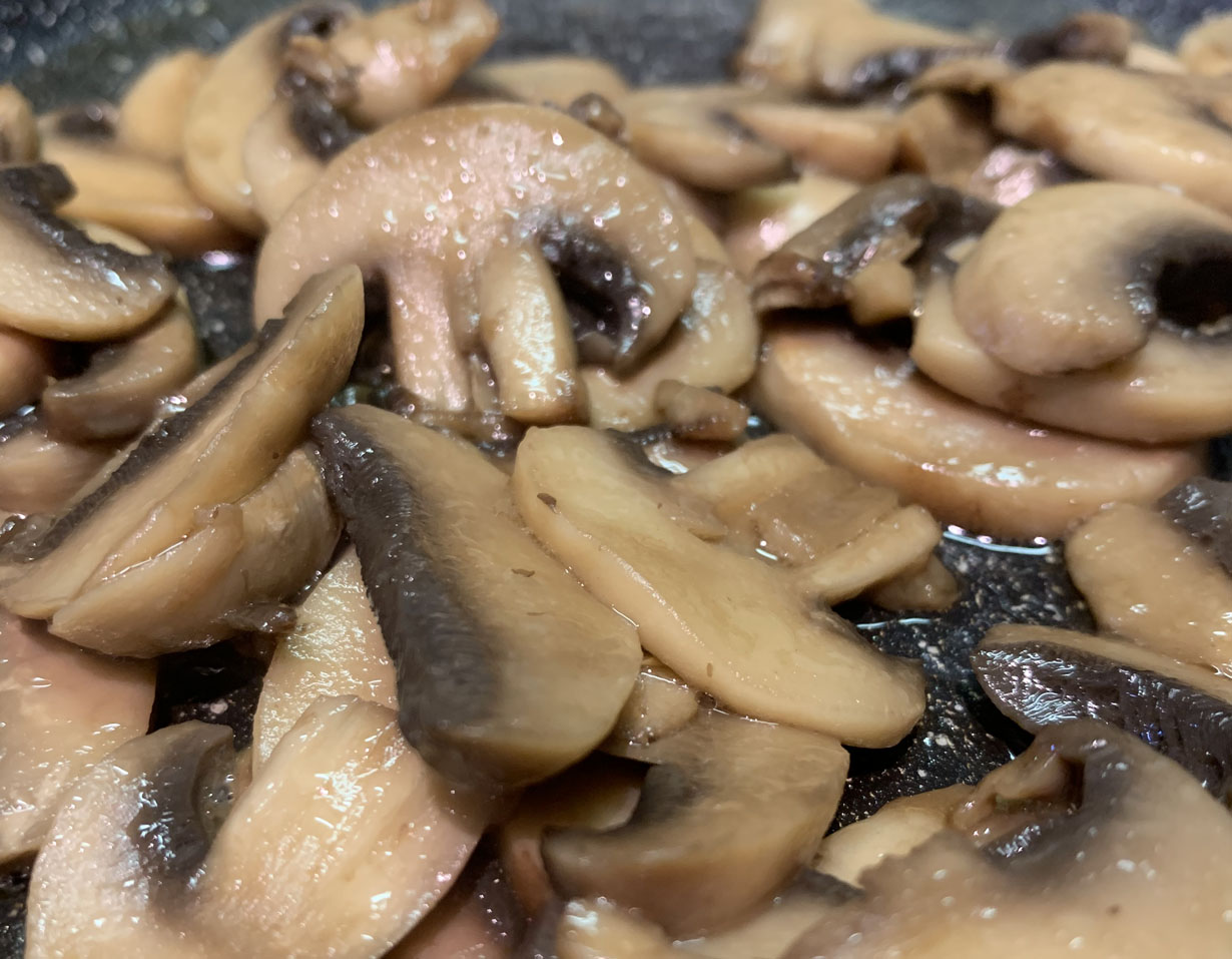 Prepare the mushrooms by melting the butter and adding sliced mushrooms to the pan. Season with salt and cook for 4 minutes. Add the stock and continue cooking until the stock is completely reduced.