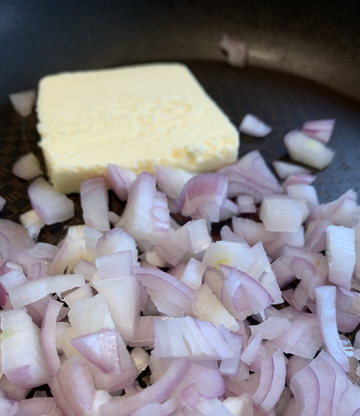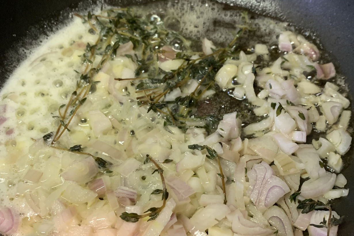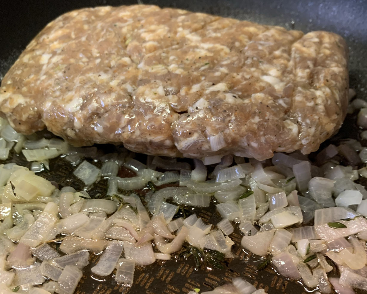 Cook the onion, shallot, and thyme sprigs in the butter for 5 minutes until translucent. Remove the thyme stocks (the leaves should have fallen off during the cooking process). Add the sausage meat and cook through thoroughly (approximately 10 to 12 minutes). Add the sausage mixture to the bread cubes.