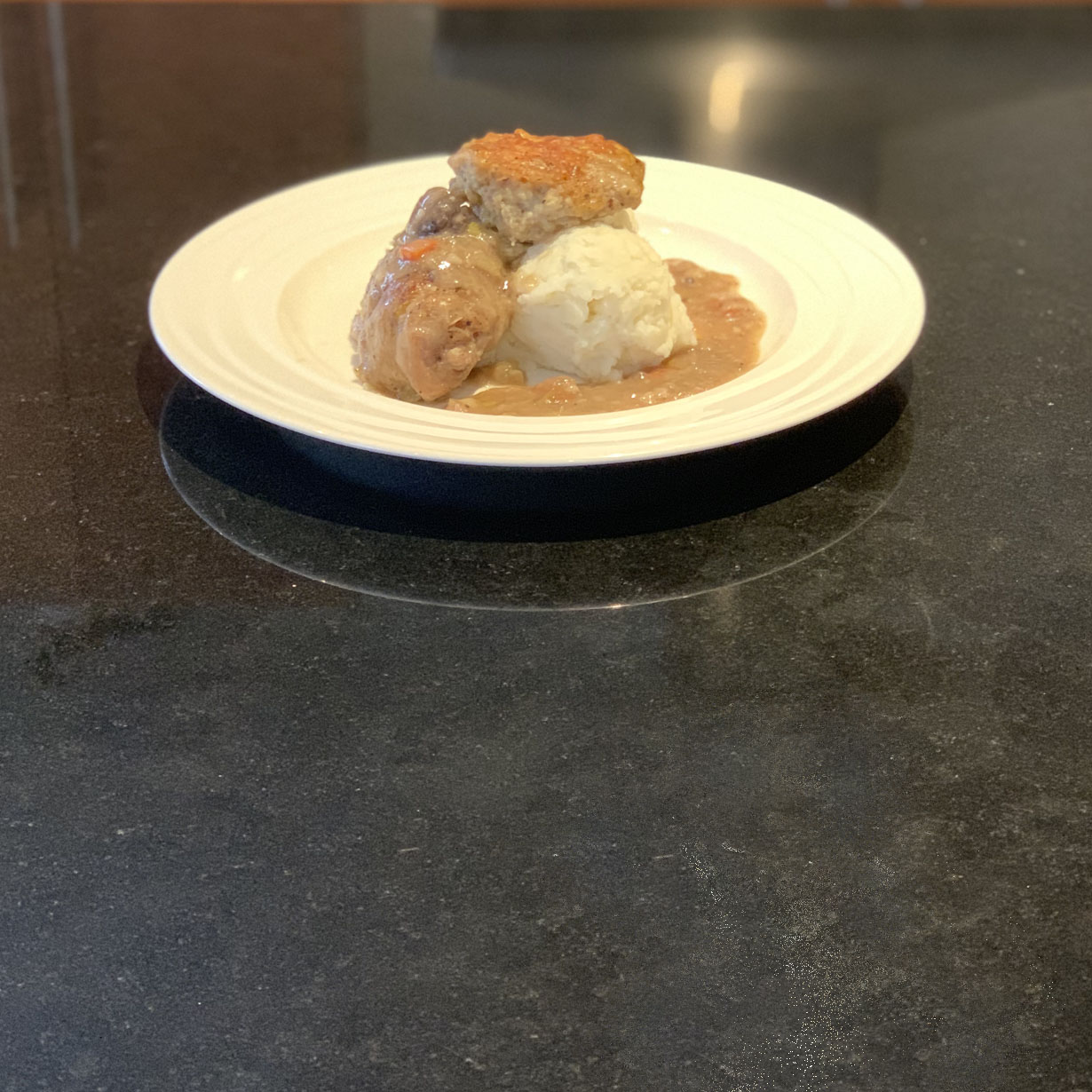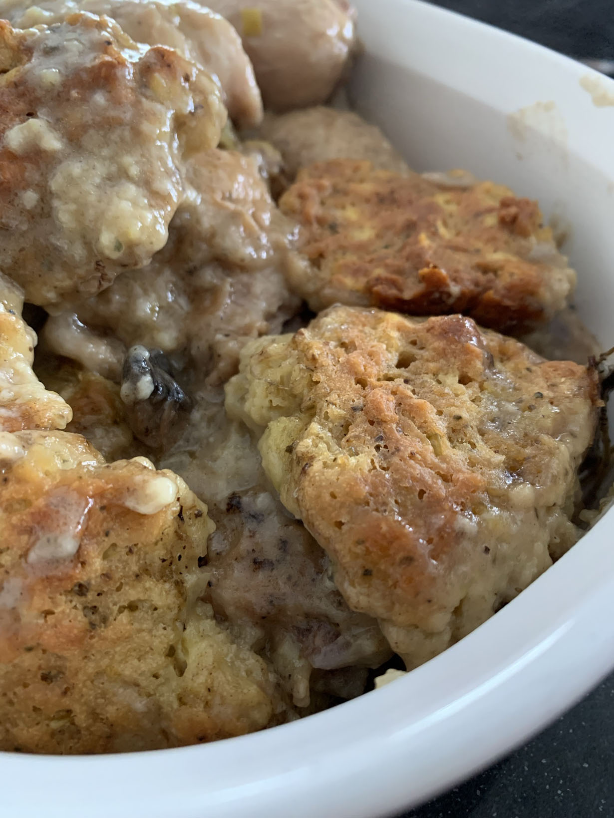 Chicken and dumplings originated in the US south and is a very hearty dish perfect for the winter months. Baking the dumplings in the broth result in little balls of stuffing-like biscuits. The sauce becomes rich, decadent, and full of flavor and is the perfect topping for mashed potatoes.