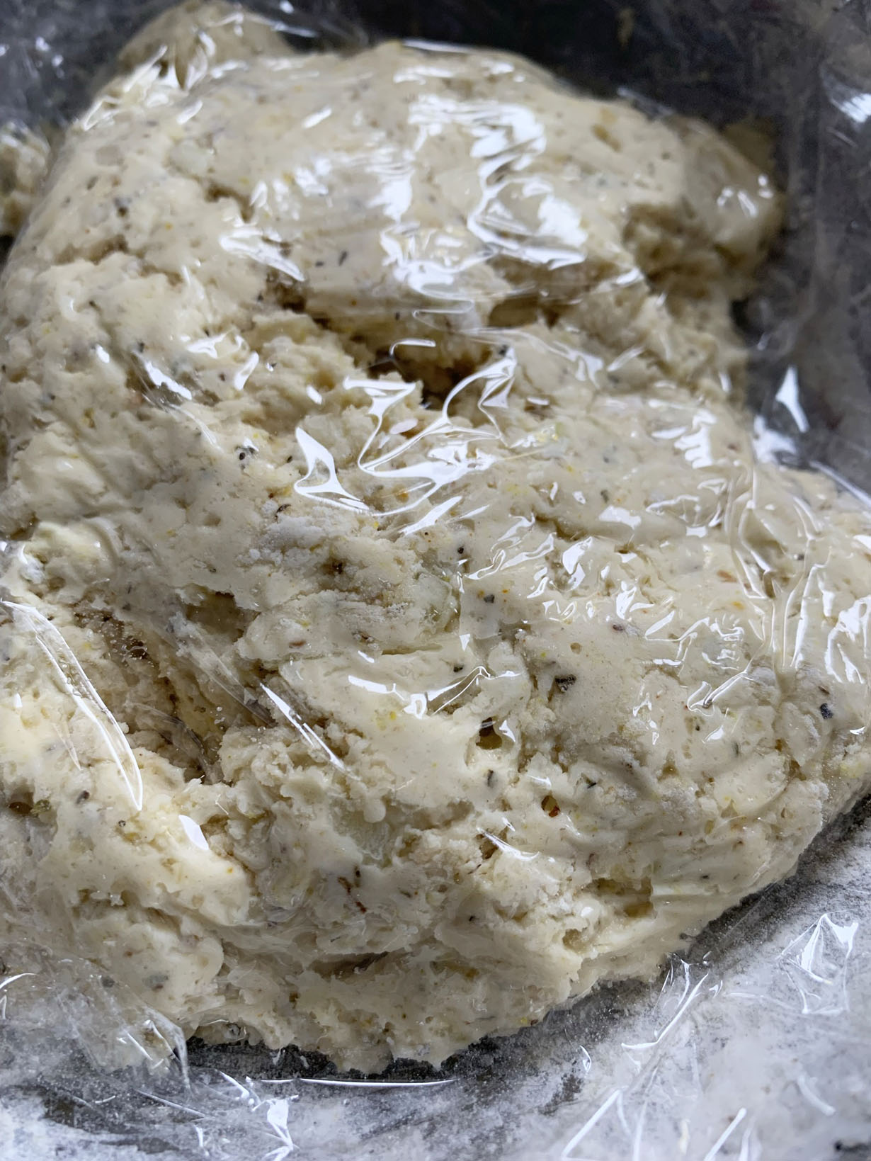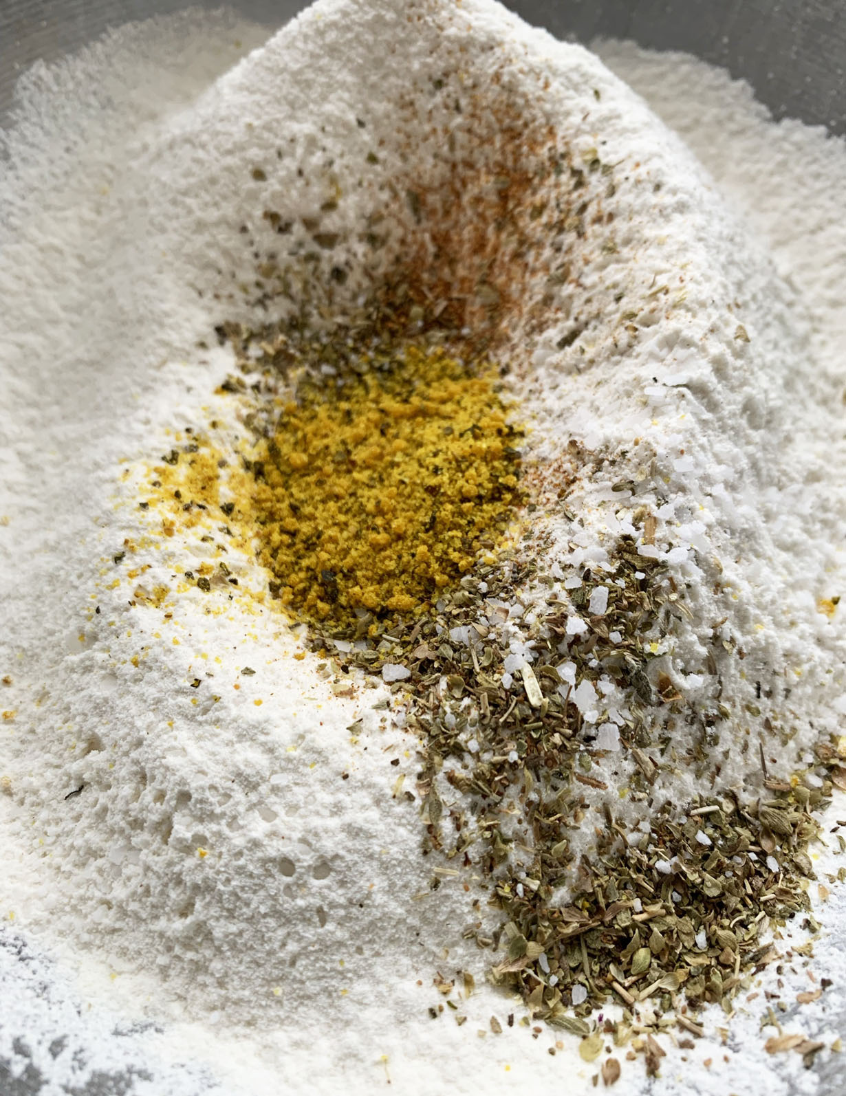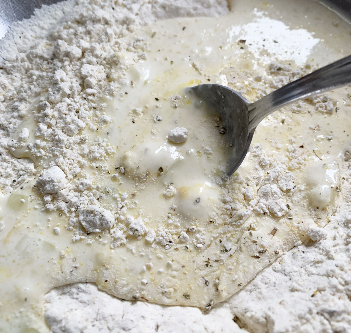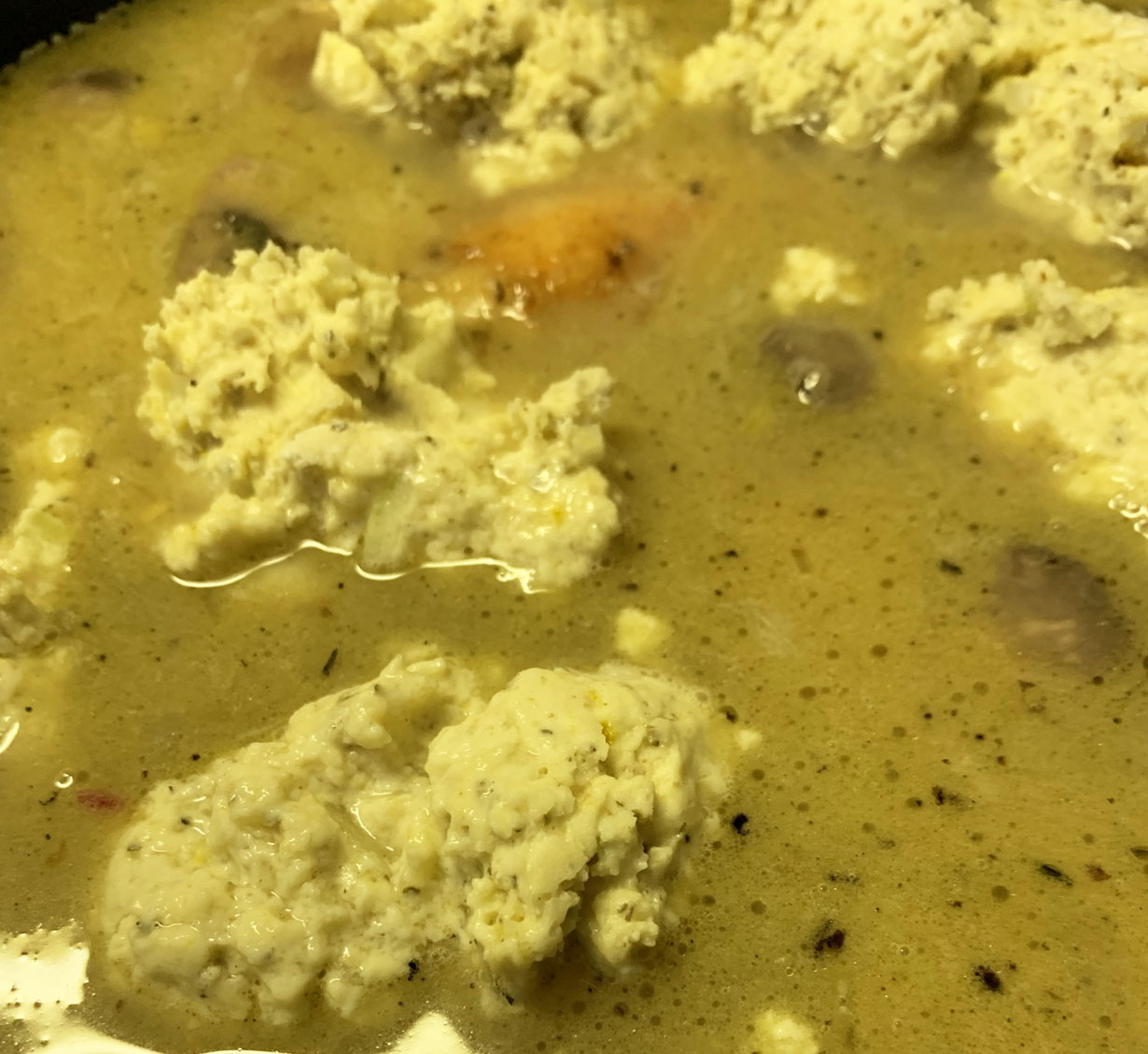 Start by preparing the dumplings. Sift the flour and baking powder into a mixing bowl. Add the oregano, cayenne pepper, lemon pepper, and salt and whisk together to mix in all the spices. Create a well in the center of the flour mixture and set it aside. In a measuring cup add the eggs and milk and whisk together. Add the melted butter and the chopped onions and blend. Add the wet ingredients into the dry ingredients and stir together until just blended. Cover with a sheet of plastic wrap resting right on the dough and refrigerate for at least 30 minutes.