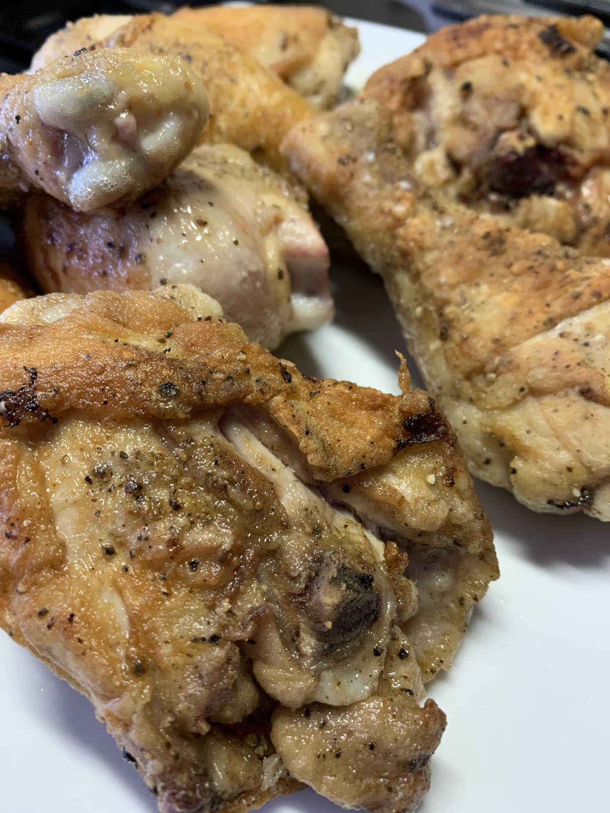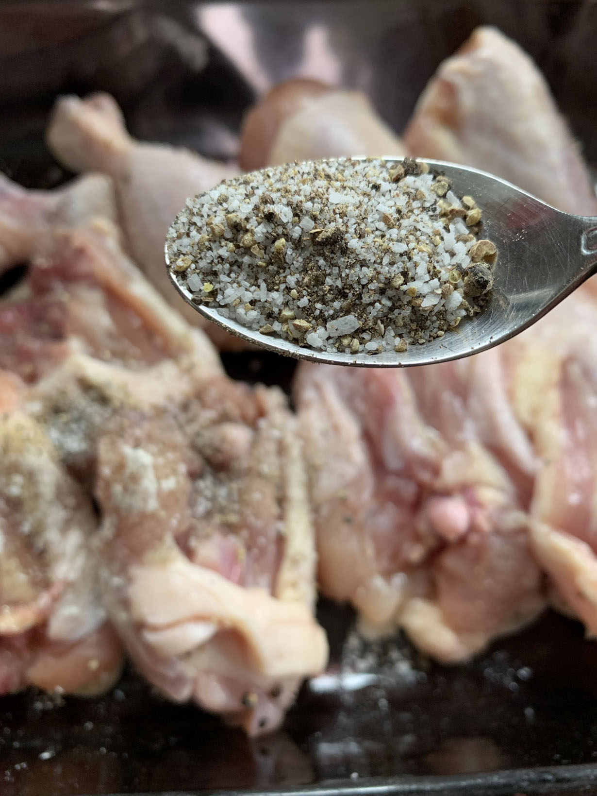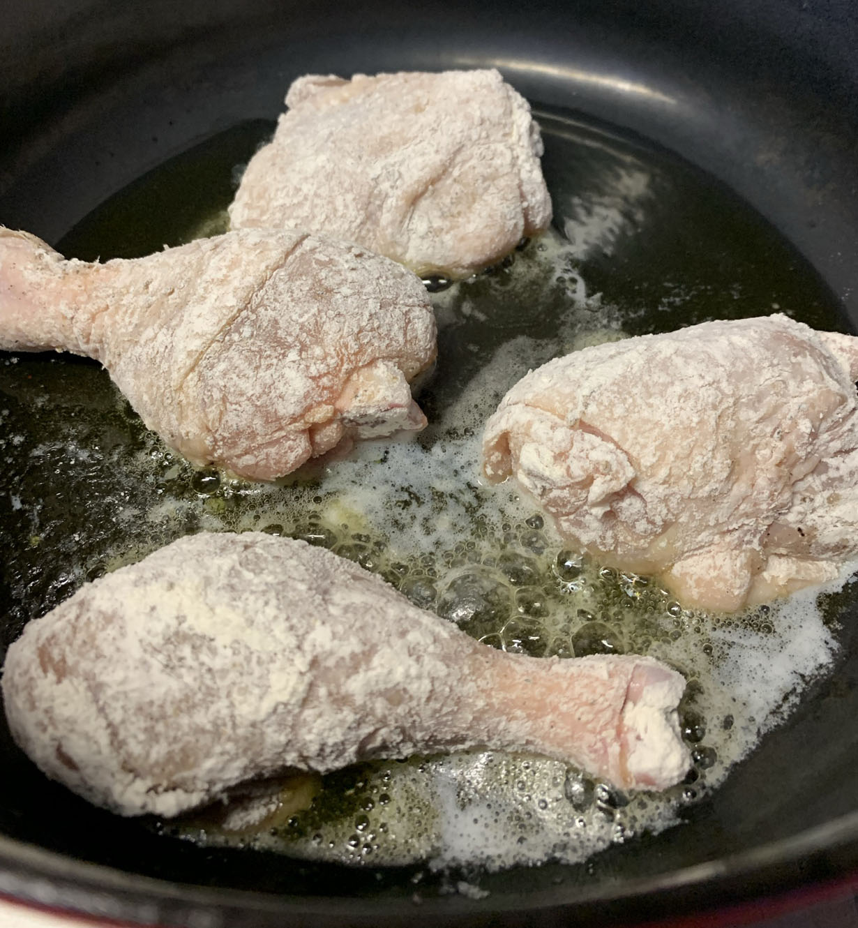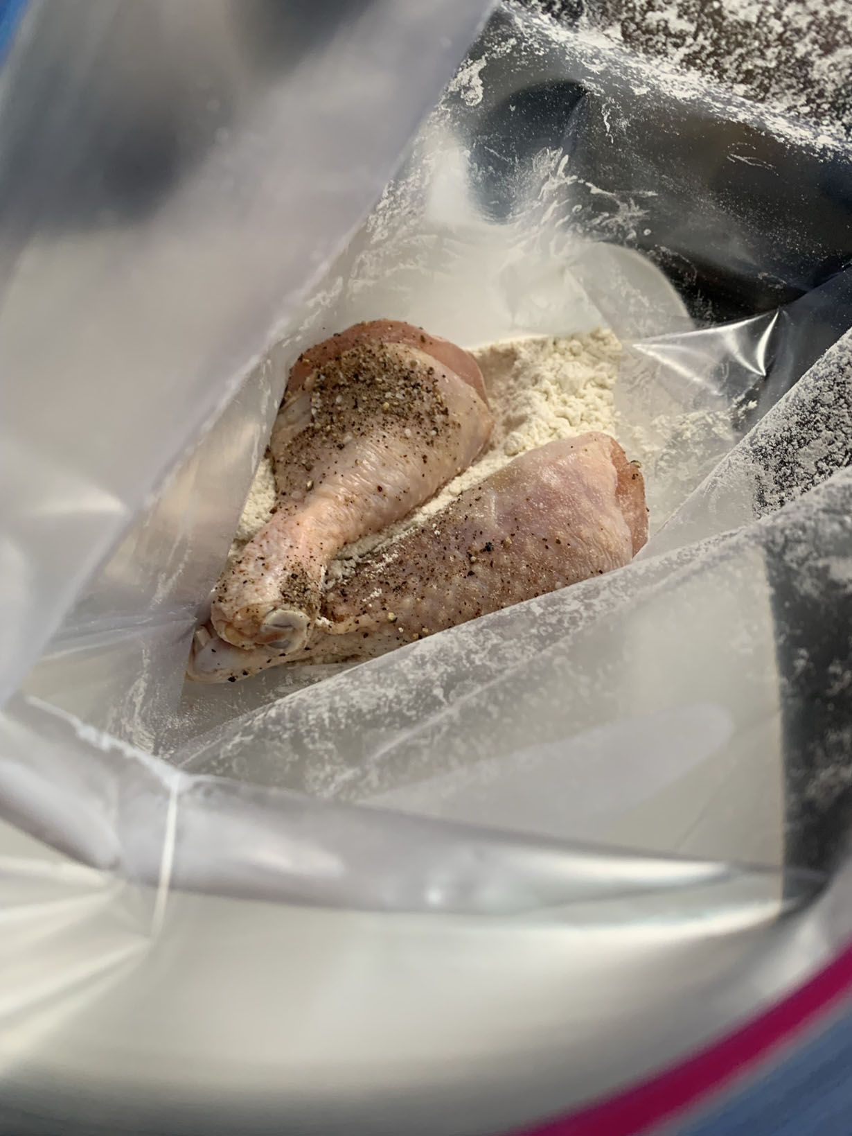 While the dumplings are chilling, prepare the stew. Place the flour into a large freezer bag. Season the chicken pieces with salt and pepper and place into the freezer bag a few pieces at a time. Close the top of the bag and shake the chicken until fully coated with the flour. Repeat until all the chicken pieces are coated. Do not throw away the remaining flour, it will be added to thicken the sauce. Once your chicken is coated, preheat your oven to 450°F.