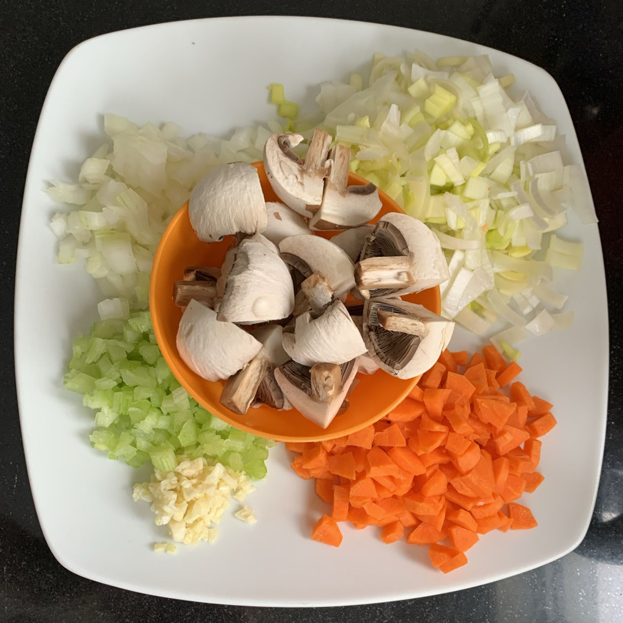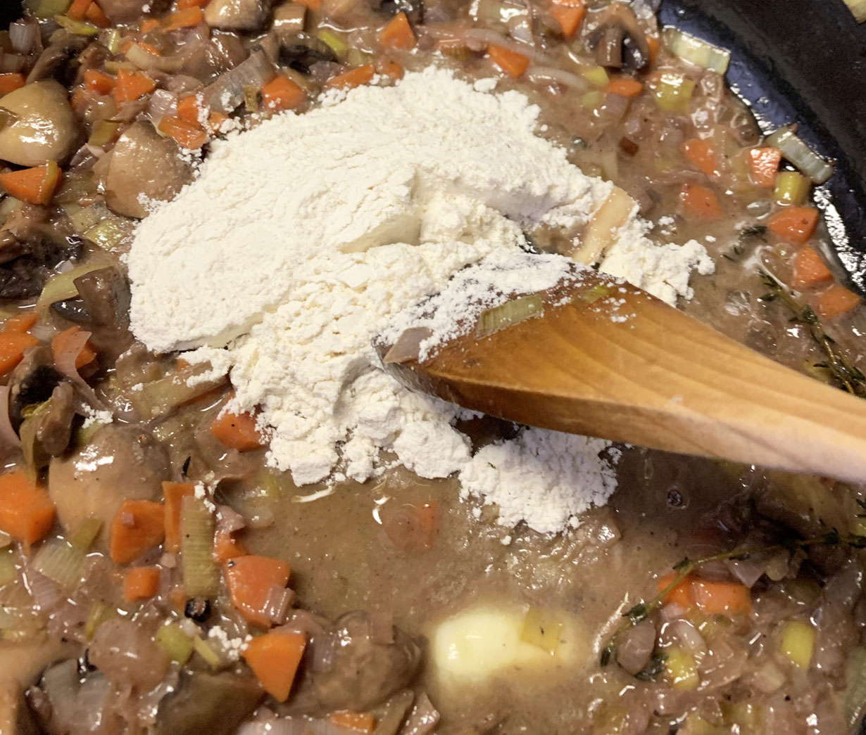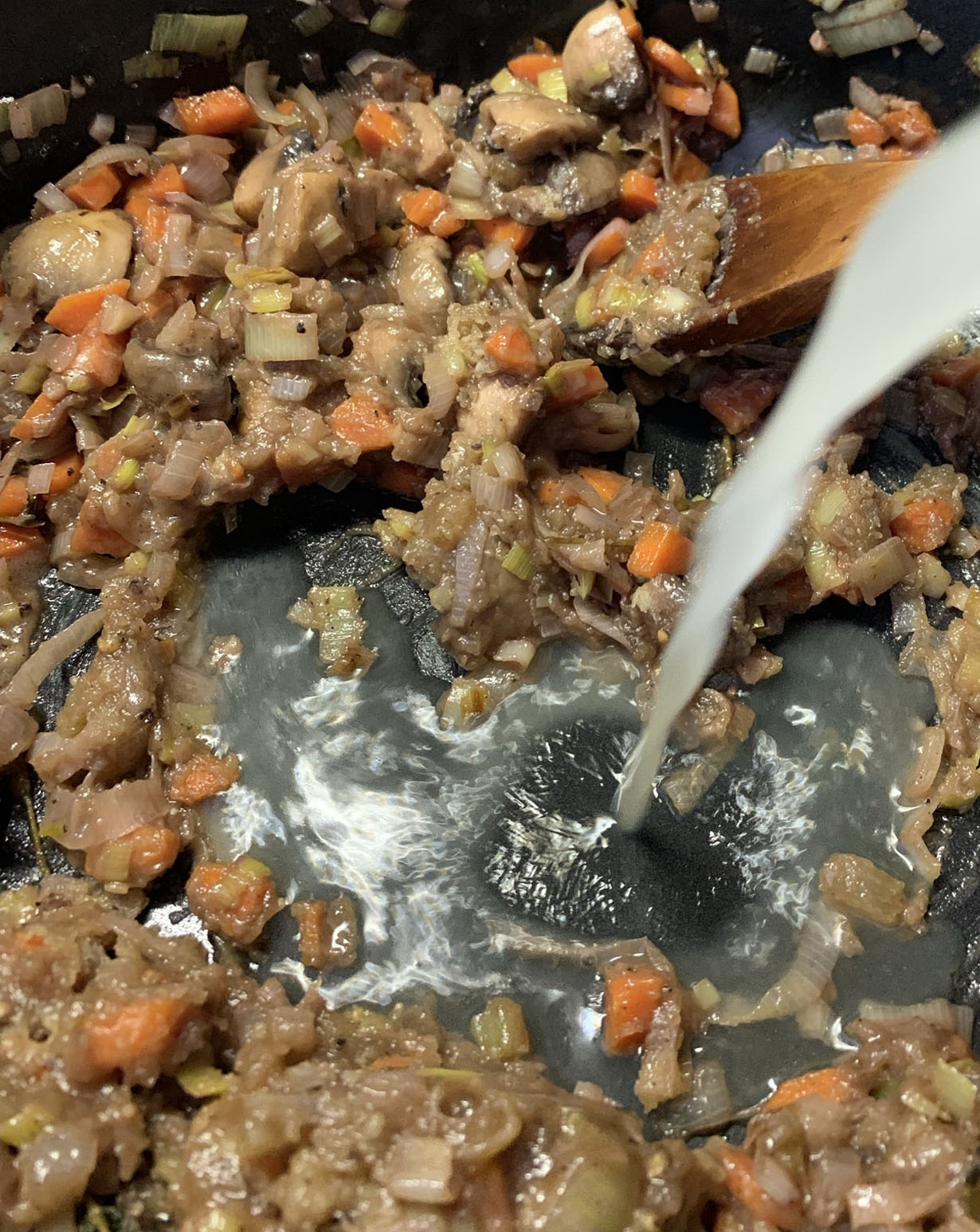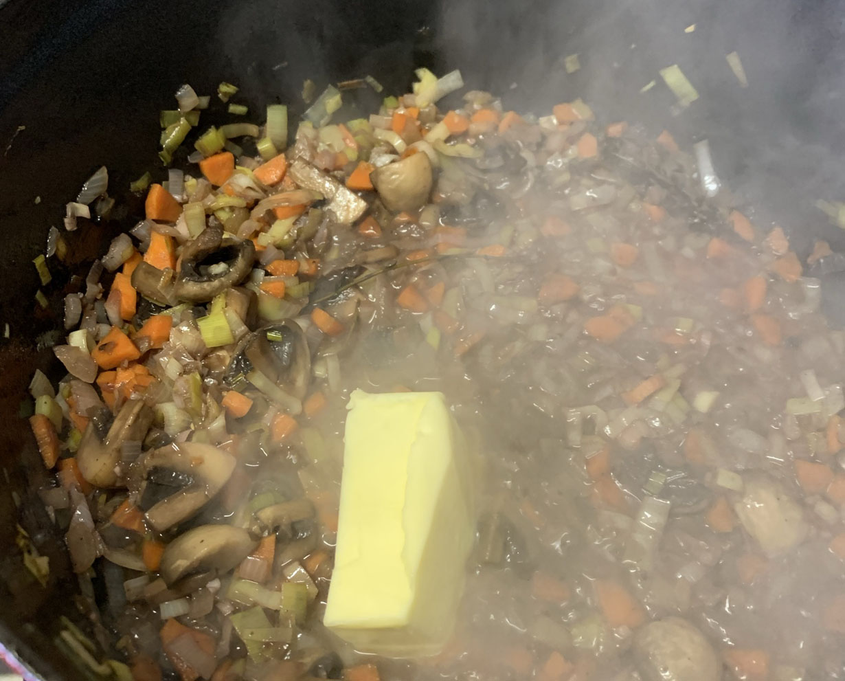 In a large cast-iron pot, melt 2 tablespoons of butter along with the olive oil until it is hot but not smoking. Add the coated chicken pieces a few at a time and cook until golden brown on both sides (approximately 10 to 12 minutes). Note: The chicken will not be fully cooked at this point. As the pieces brown, transfer them to a plate and continue with the remaining chicken pieces until all the pieces have been seared. When the chicken is browned, remove half the oil/butter mixture and add the onion, celery, carrot, leek, garlic, and mushrooms. Season with a bit of salt and pepper and add the thyme sprigs. Cook for about 8 minutes, or until the vegetables are tender. Add the wine, cooking for a few minutes to reduce it to half. Add 1/2 cup butter and stir until melted into the vegetables and wine. Add the flour and stir until the vegetables are coated. Add the chicken broth and stir to incorporate the flour.