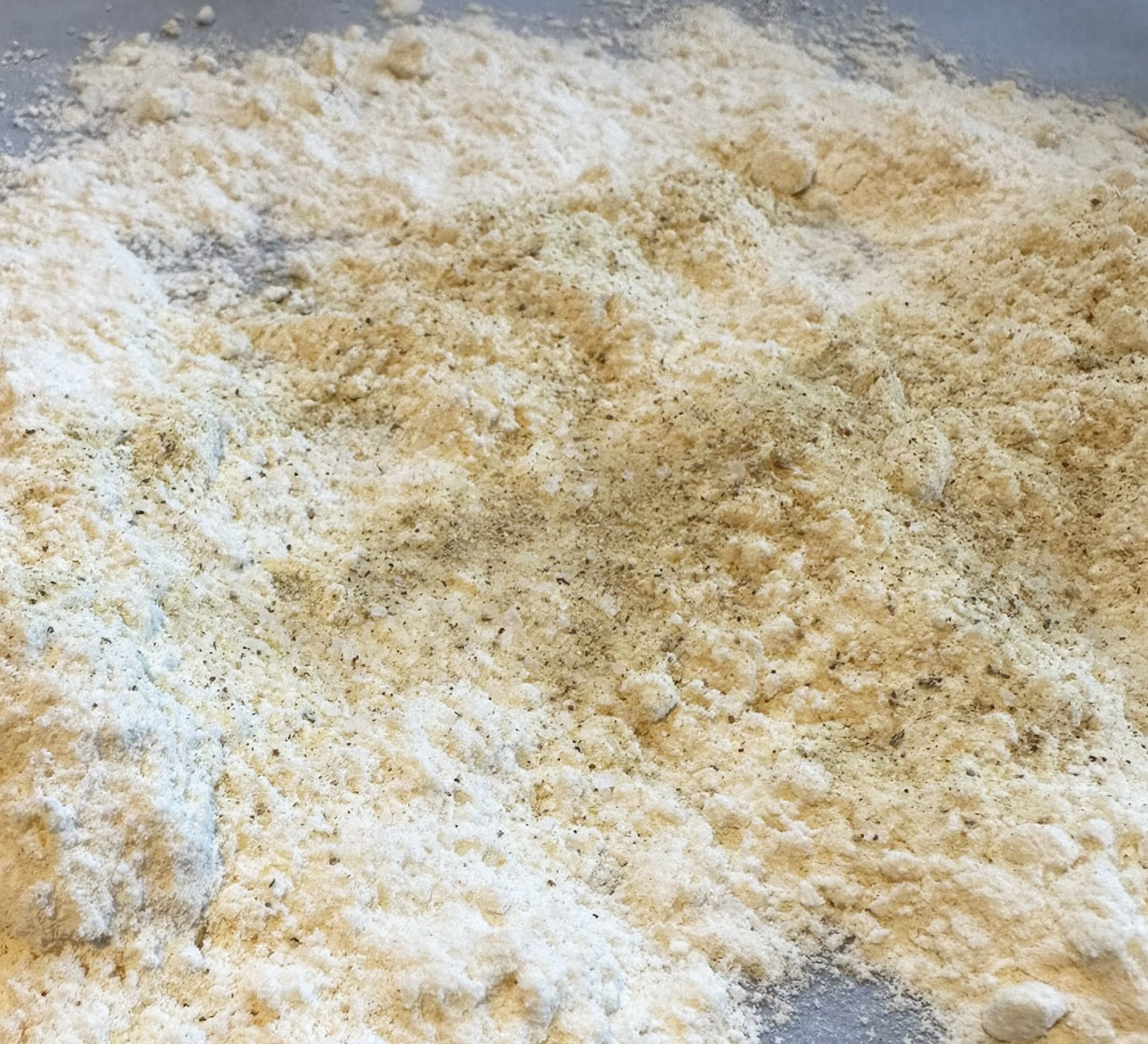 Mix together the crumbled feta, walnuts, and parsley and set aside. Mix together the flour, salt, and pepper on a piece of parchment paper. Set aside for dredging.