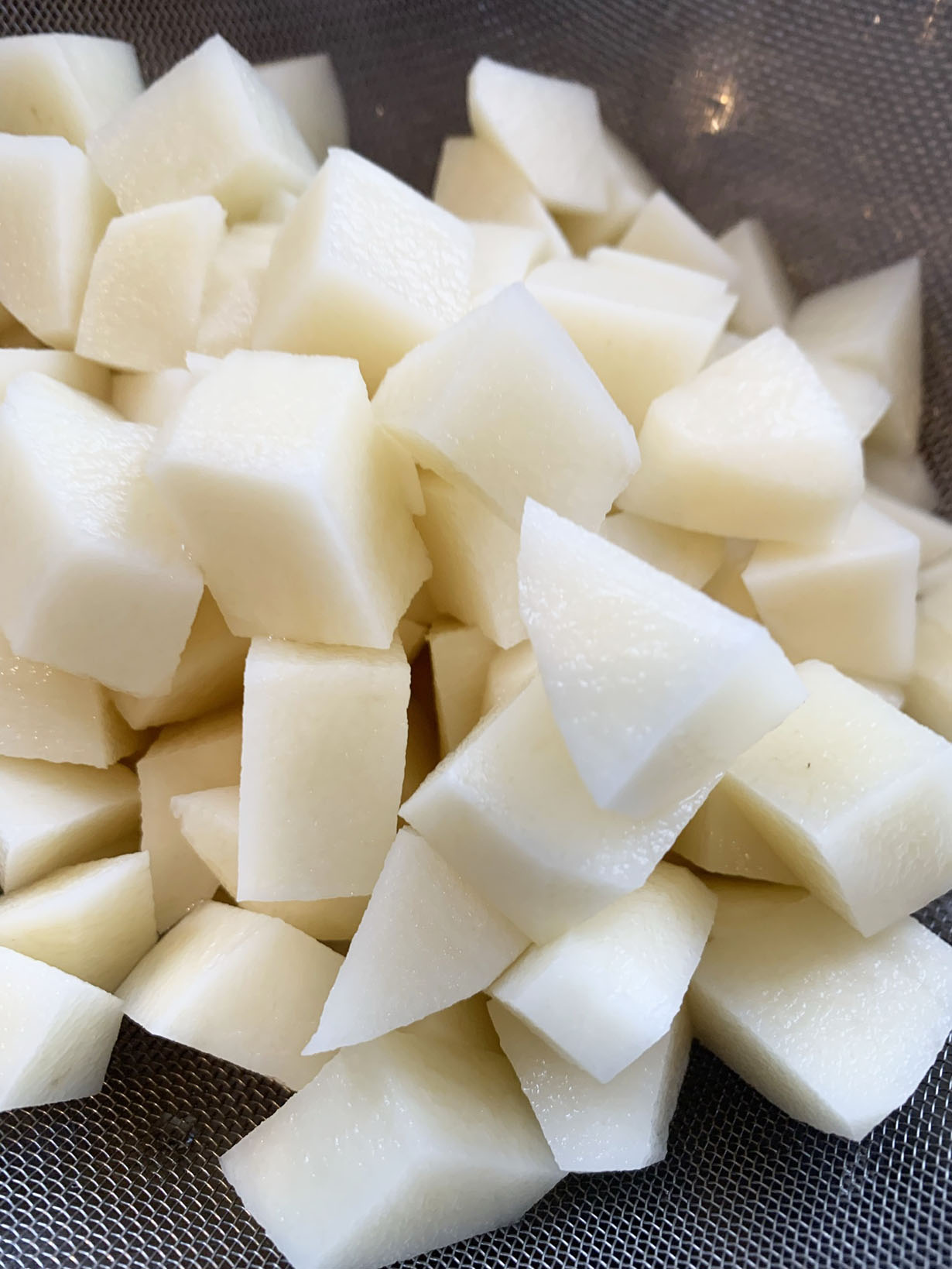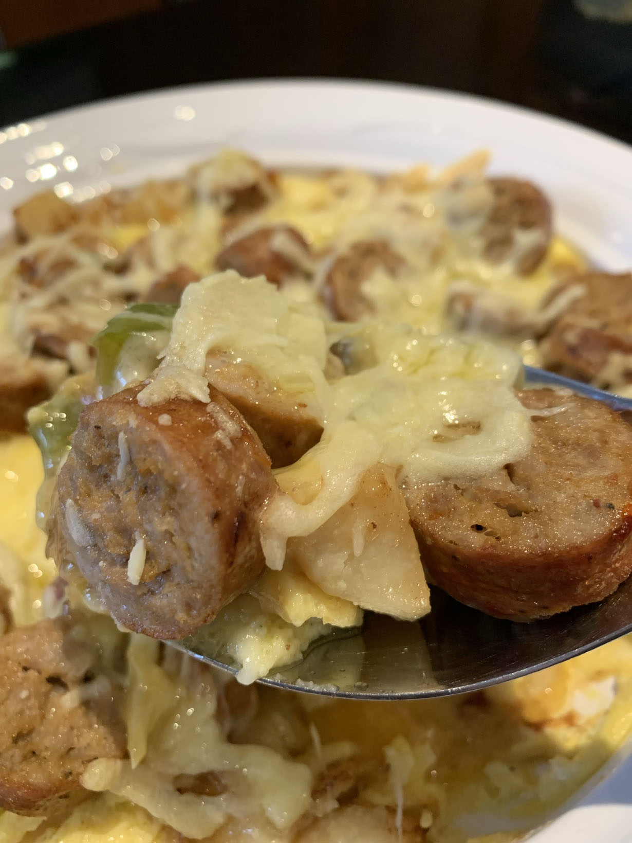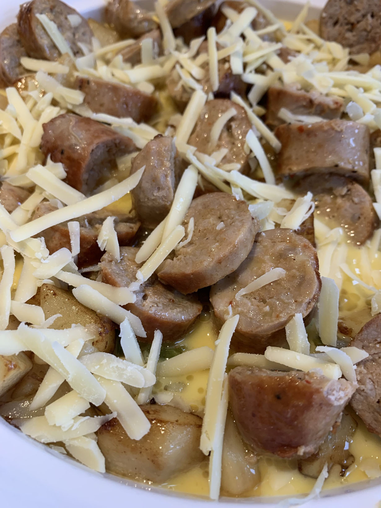 Preheat the oven to 350°F. Slice the sausage into 1/2” pieces and scatter over the potato hash. In a medium-sized bowl, whisk together the eggs, cream, salt, and pepper. Pour over the potato-sausage mixture. Cover the entire surface with the grated cheese and bake for 30 minutes or until the cheese has melted and is golden in color.