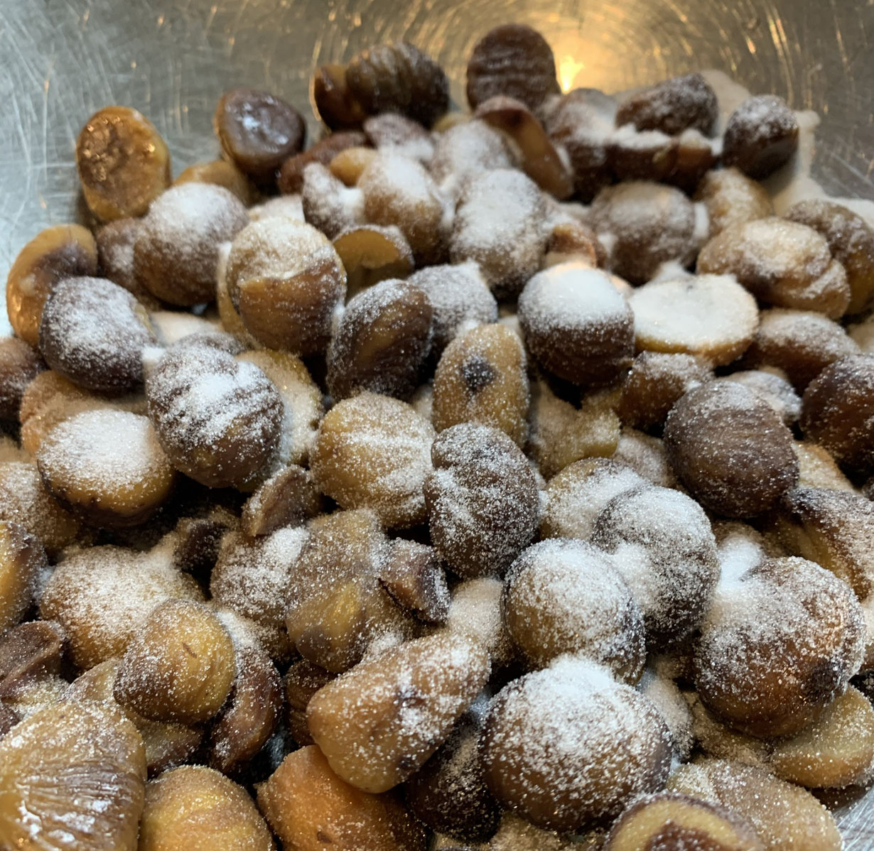 Pan fry turkey livers (from the turkey) in olive oil for 3 minutes, turning once. Remove from the heat and chop finely. Set aside. In a large bowl, grind the chestnuts with the sugar using a masher until finely ground. Set aside.